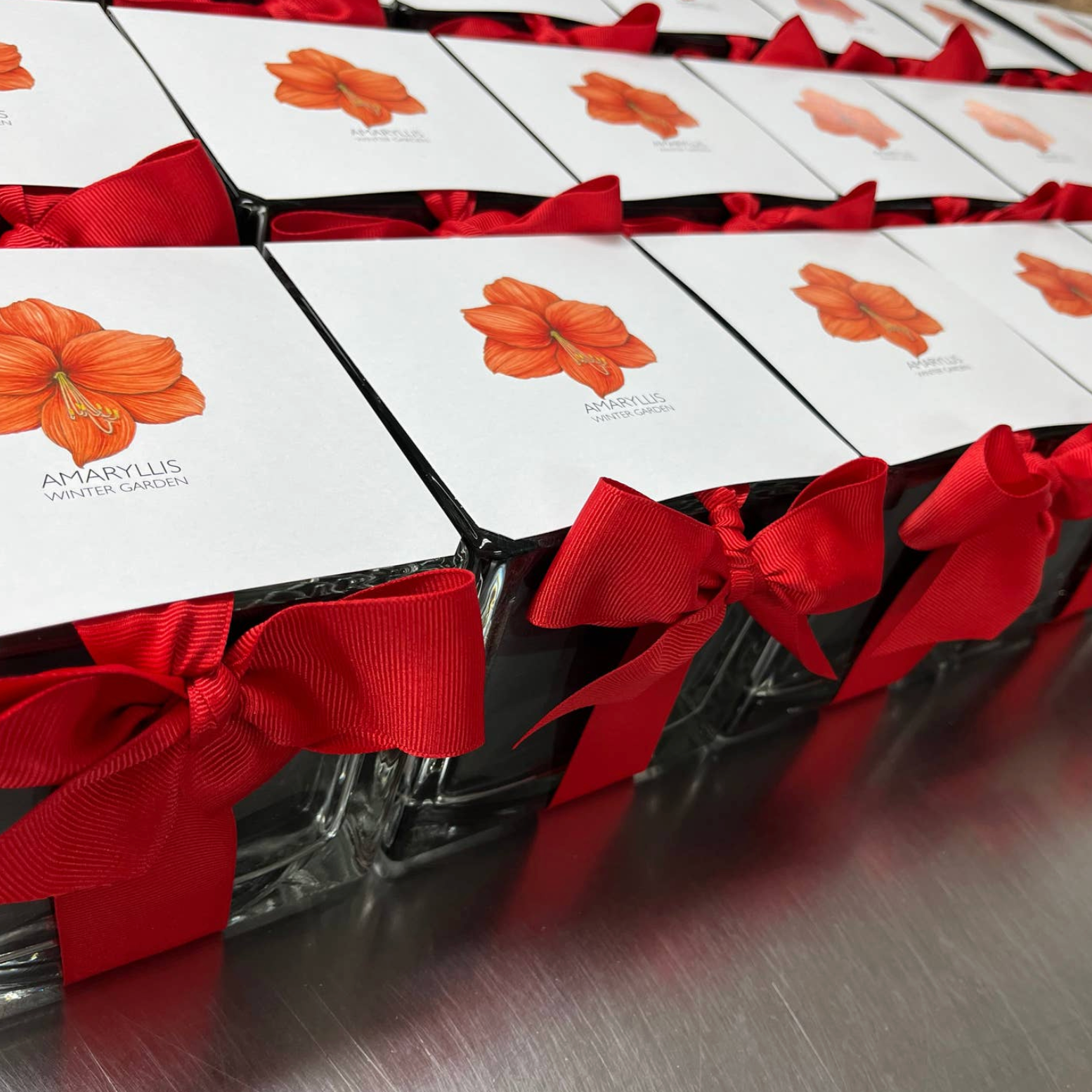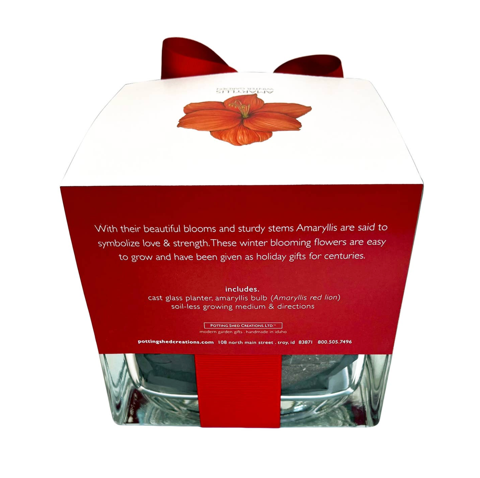 Amaryllis Winter Garden The classic Christmas holiday gift. With beautiful blooms and sturdy stems, Amaryllis are said to symbolize love & strength. These winter blooming flowers are easy to grow and have been given as holiday gifts for centuries. includes: cast glass planter, amaryllis bulb (Amaryllis red lion), soil-less growing medium and directions . handmade in Idaho Once planted, amaryllis bloom time is 6-12 weeks. Keeping plants cool (around 65 degrees F) will extend bloom time.