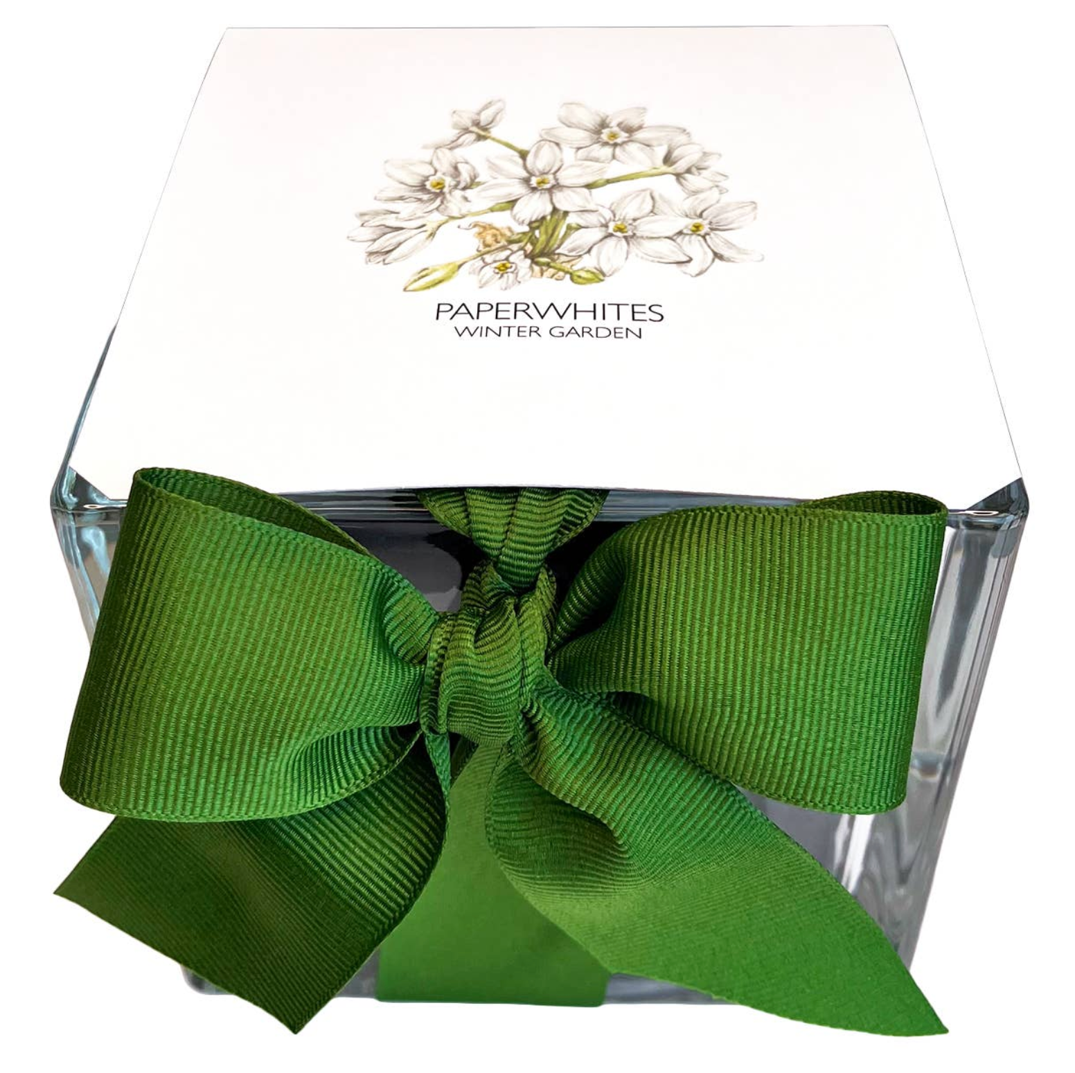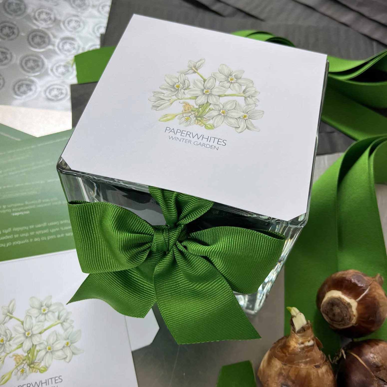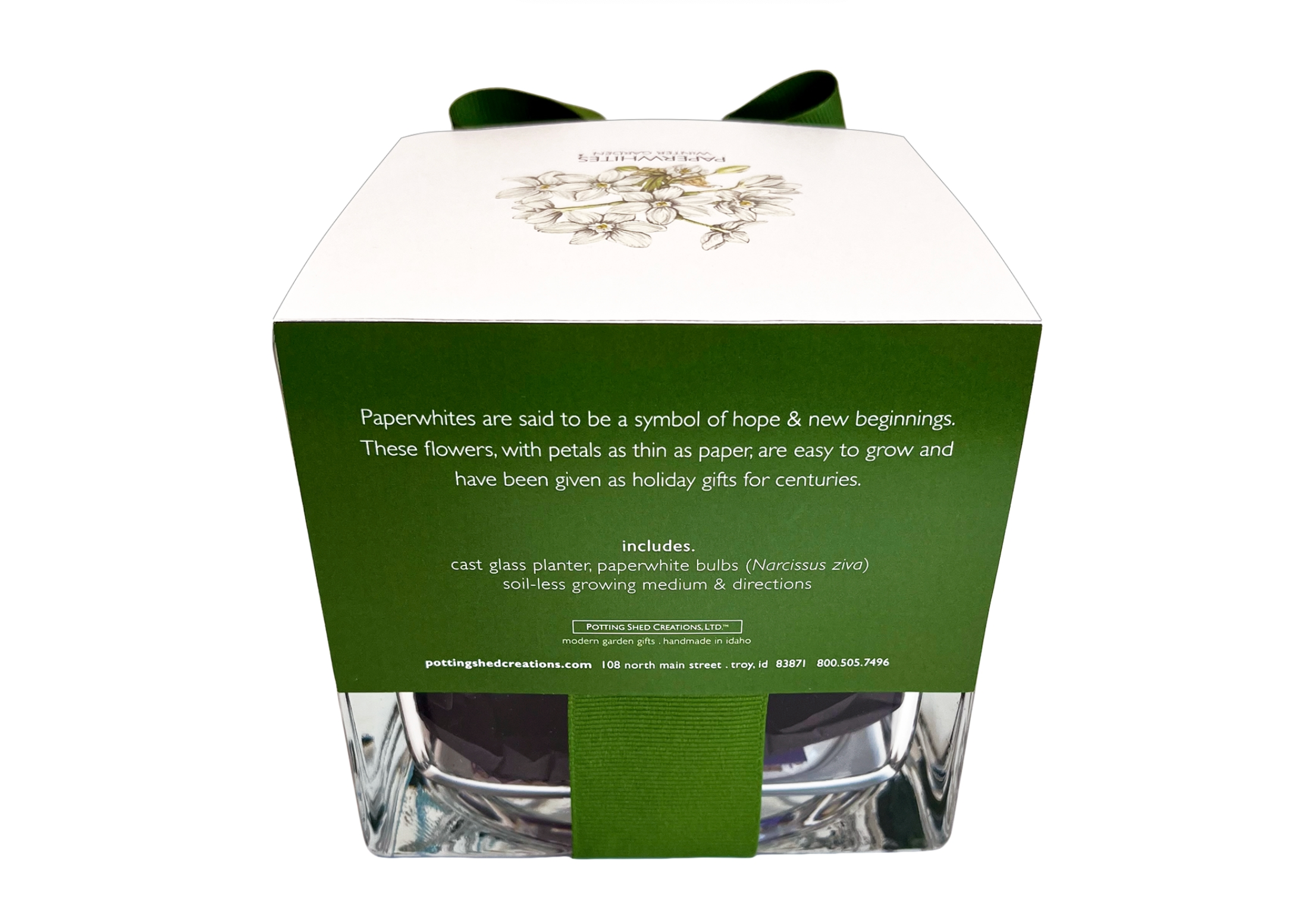 Our Best Selling Paperwhites Winter Garden (Narcissus ziva) Paperwhites are said to be a symbol of hope & new beginnings. These flowers, with petals as thin as paper, are easy to grow and have been given as Holiday and Christmas gifts dating back to the 1700s. includes: cast glass planter with hand-tied grosgrain ribbon, paperwhite bulbs (Narcissus ziva), soil-less growing medium and directions . handmade in Idaho. Plant by 01/31/2026 Once planted, bloom time is 3-5 weeks. Keeping plants cool (around 65 degrees F) will extend bloom time.