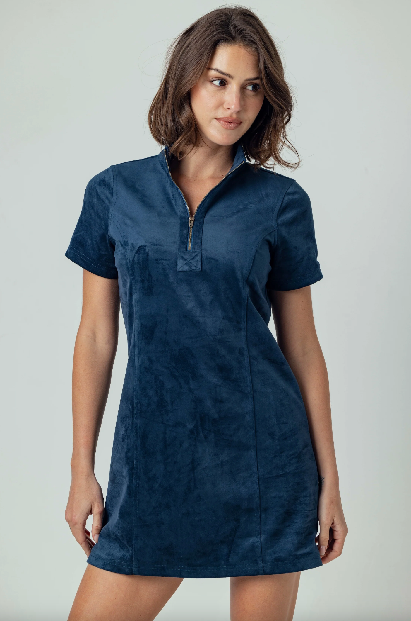 Designed in suede with princess seams along the front, this style features a three-quarter zip neckline and classic short sleeves. Cut to mid-thigh on most wearers and fully lined through the body, it offers a streamlined, elevated finish.