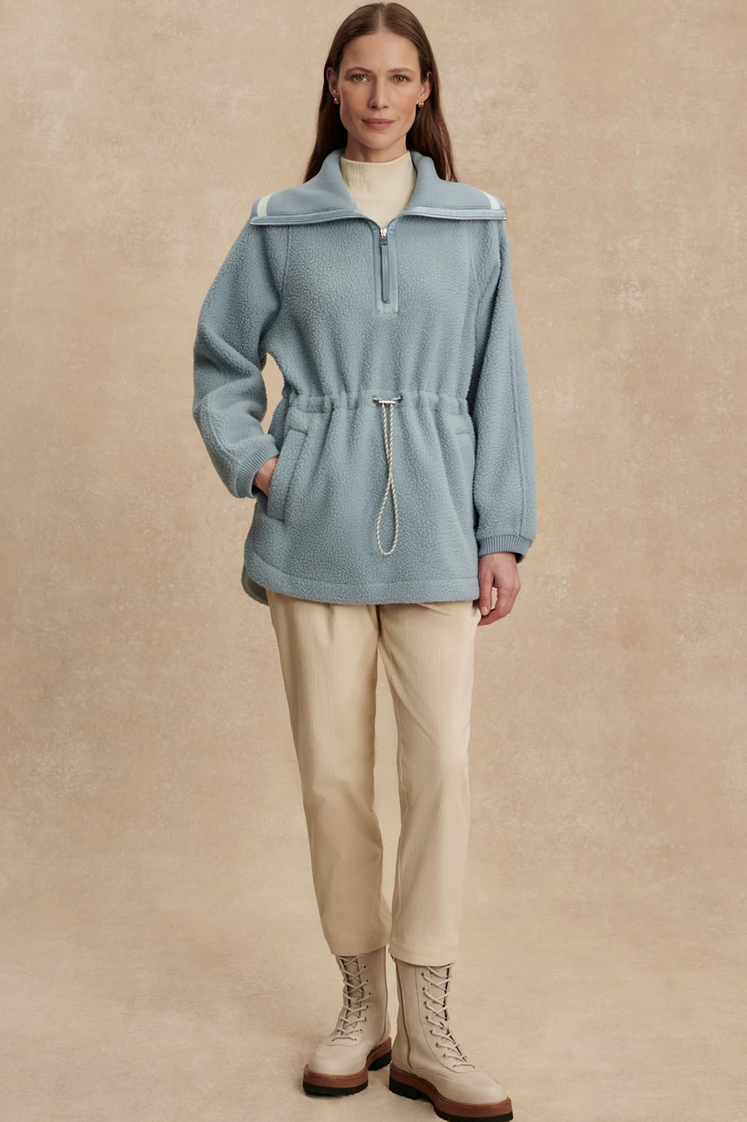 The Ashby is a longline half-zip made from our warm and insulating Plush Borg Fleece and refined with stripe detailing along the collar. It's cut to an oversized fit with an adjustable toggle waist that can be cinched in - perfect for layering over leggings, baselayers, and pants alike.
