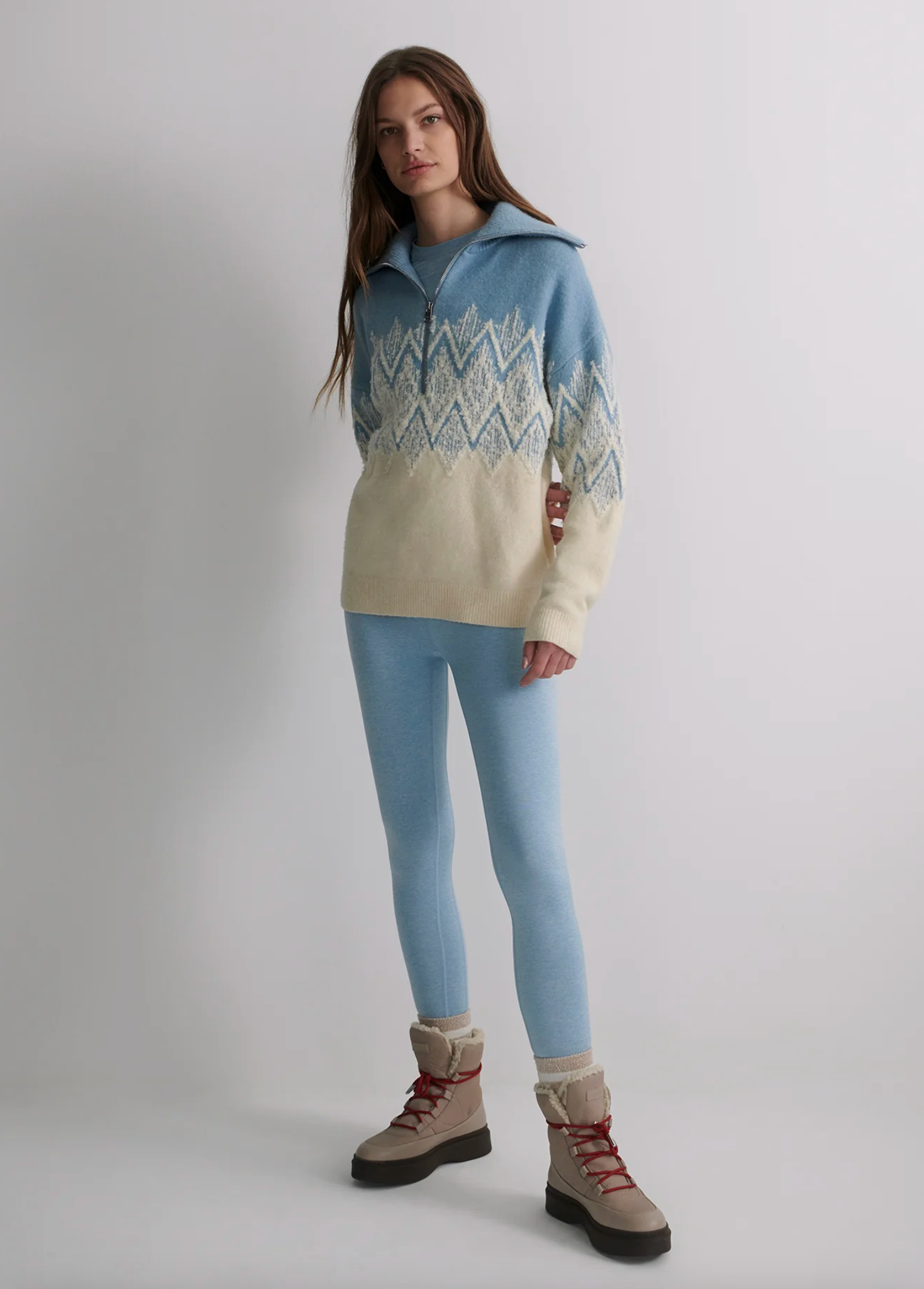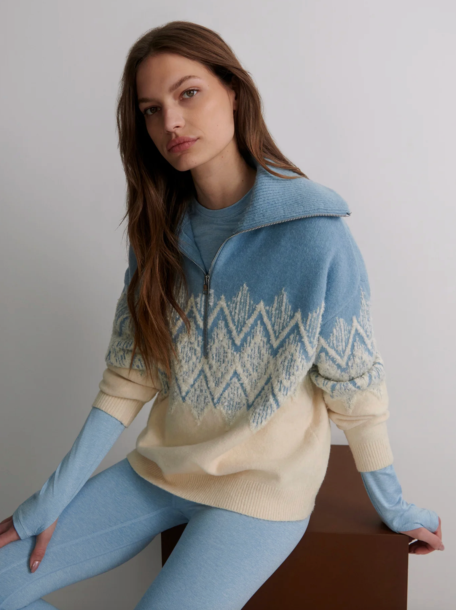 The Hedda combines a luxurious merino-blend yarn with a jacquard Fairisle pattern in a bouclé yarn for added texture. Super soft and comfortable, it's cut to a relaxed, longline shape and complete with a half-zip collar. Pair with the matching Sebastian 2.0 scarf for a coordinated look.