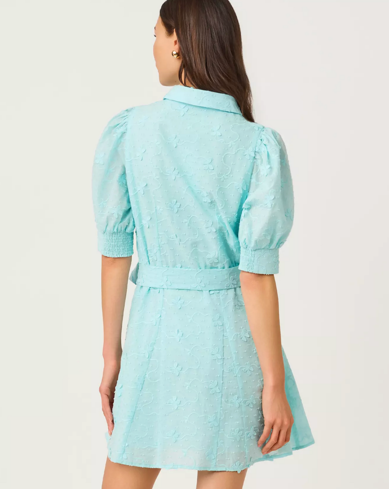 - Fit-and-flare shirtdress with short sleeves, tall cuffs, godets at the skirt, and a separate sash.