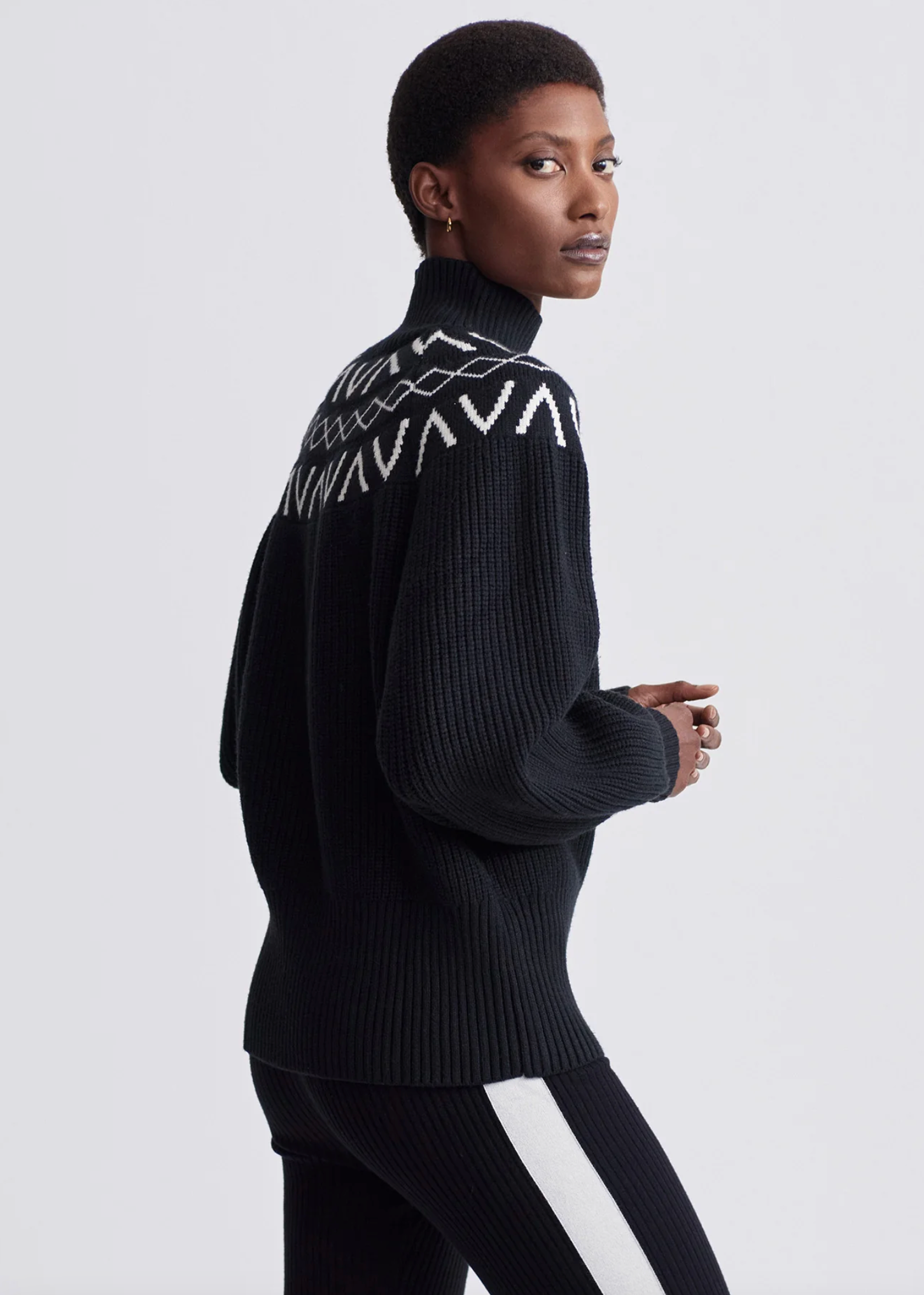 This piece boasts a relaxed fit, turtleneck, and chic balloon sleeves, complemented by an intricate all-over ribbed design and contemporary V monogram Fair Isle yoke. Complete the look by pairing the sweater with our matching beanie for an effortlessly stylish ensemble.
