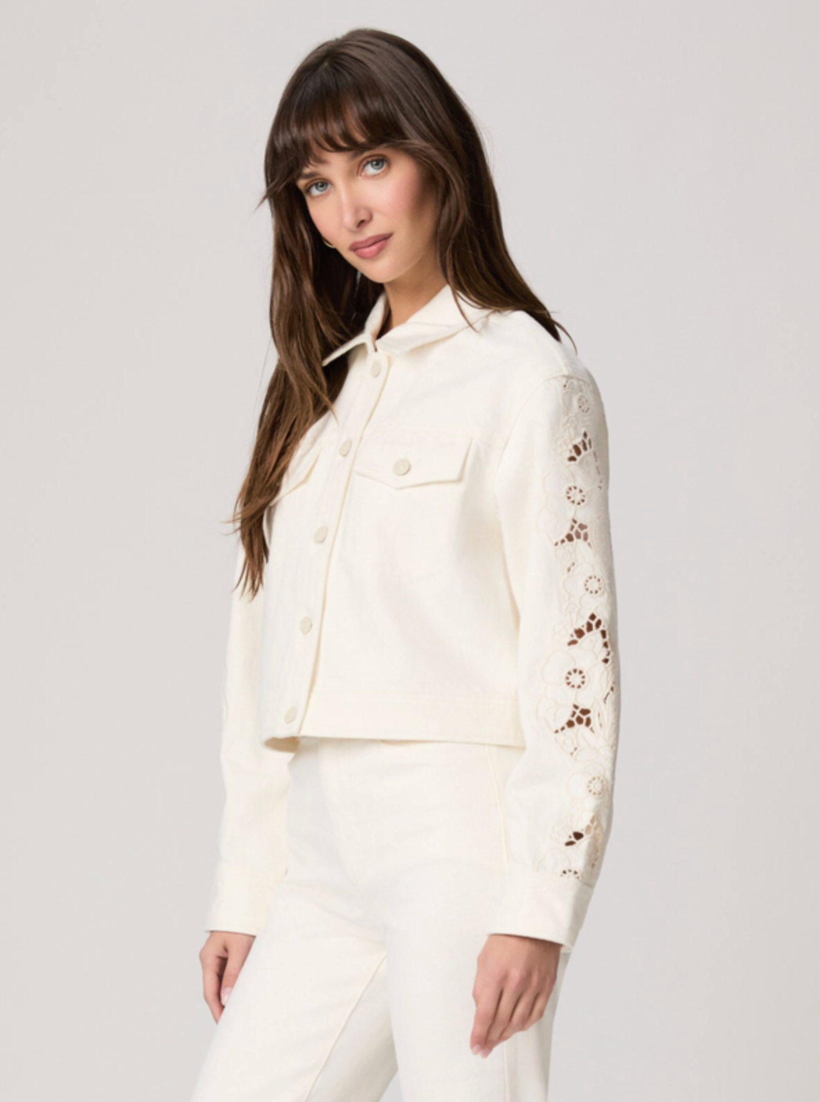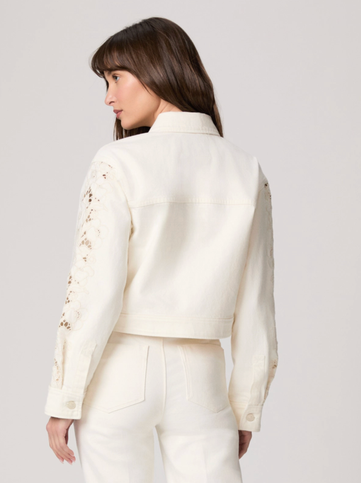 The Michele Jacket, reimagined in a tonal ecru wash with embroidered floral panels along the sleeves. Crafted from our Rigid denim with a soft-hand feel for premium comfort, this cropped silhouette features double front patch pockets and tonal ecru buttons.