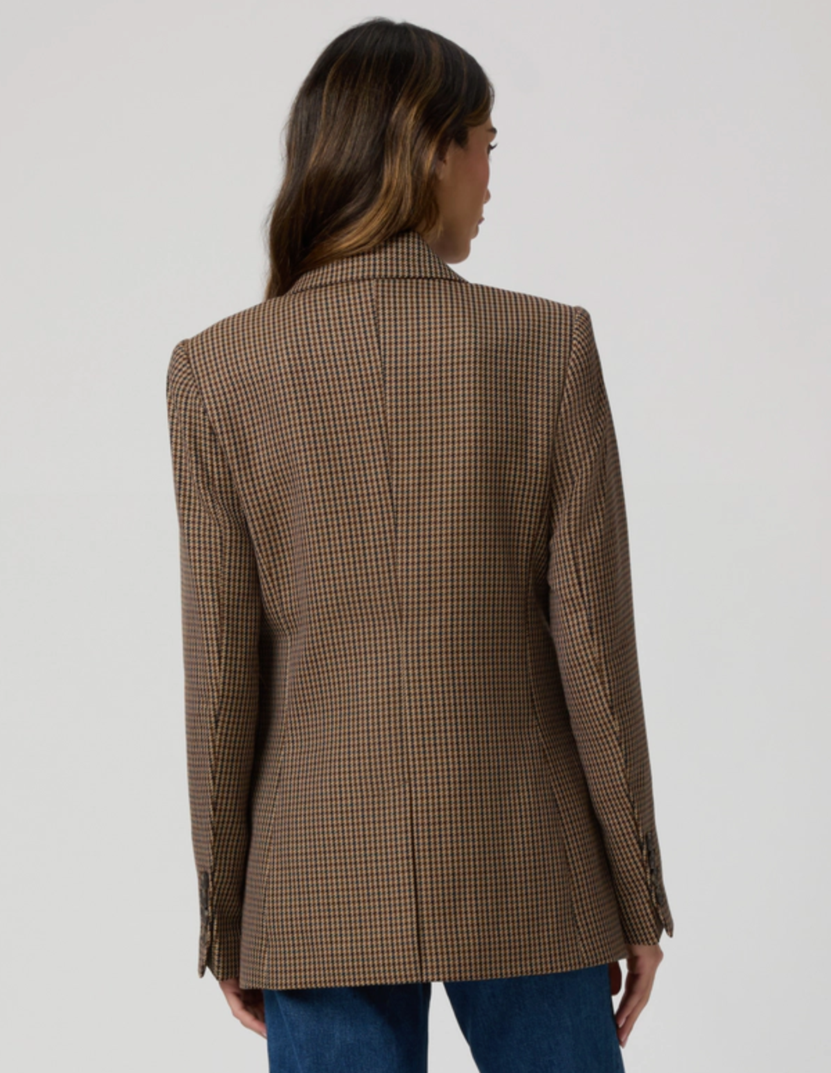 The Quentin Blazer is crafted from our new wool blend in a classic brown houndstooth print. This double-breasted blazer features a notched collar and lapel with a relaxed fit and a new, refined inside lining. Designed with welt pockets and finished with horn buttons, this piece combines timeless style with modern sophistication. Pair it with the matching Bobbi Skirt for an elevated suiting set.
