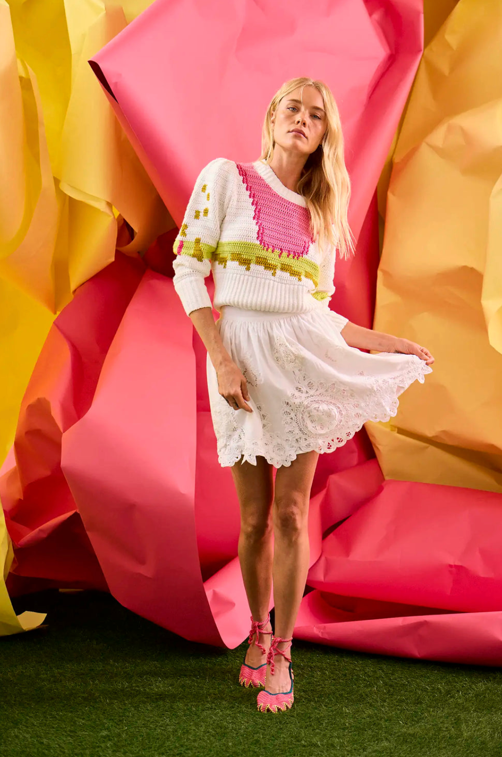 Introducing the Sully Pullover, a lightweight crochet sweater in white  multi - perfect for early spring layering. Designed with a banded crew  neck and long, full sleeves, Sully offers an airy, textural look that  feels effortless and fresh.