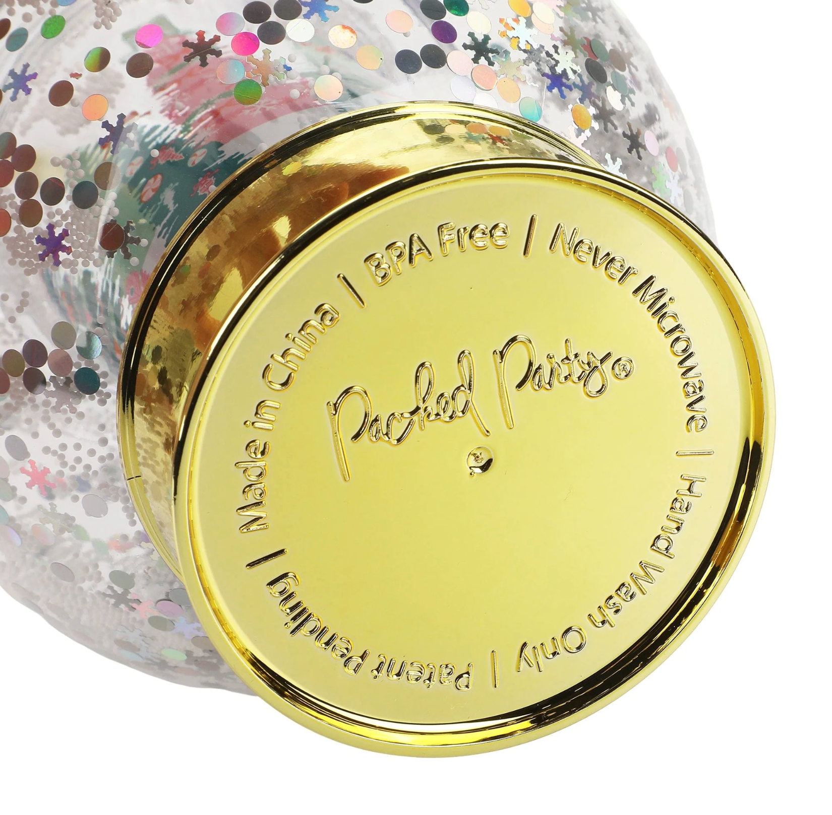 - Printed Christmas scene inner chamber with shakeable "winter wonderland" mix confetti, gold base and gold reusable straw.