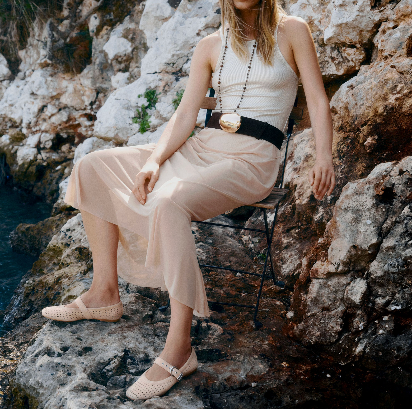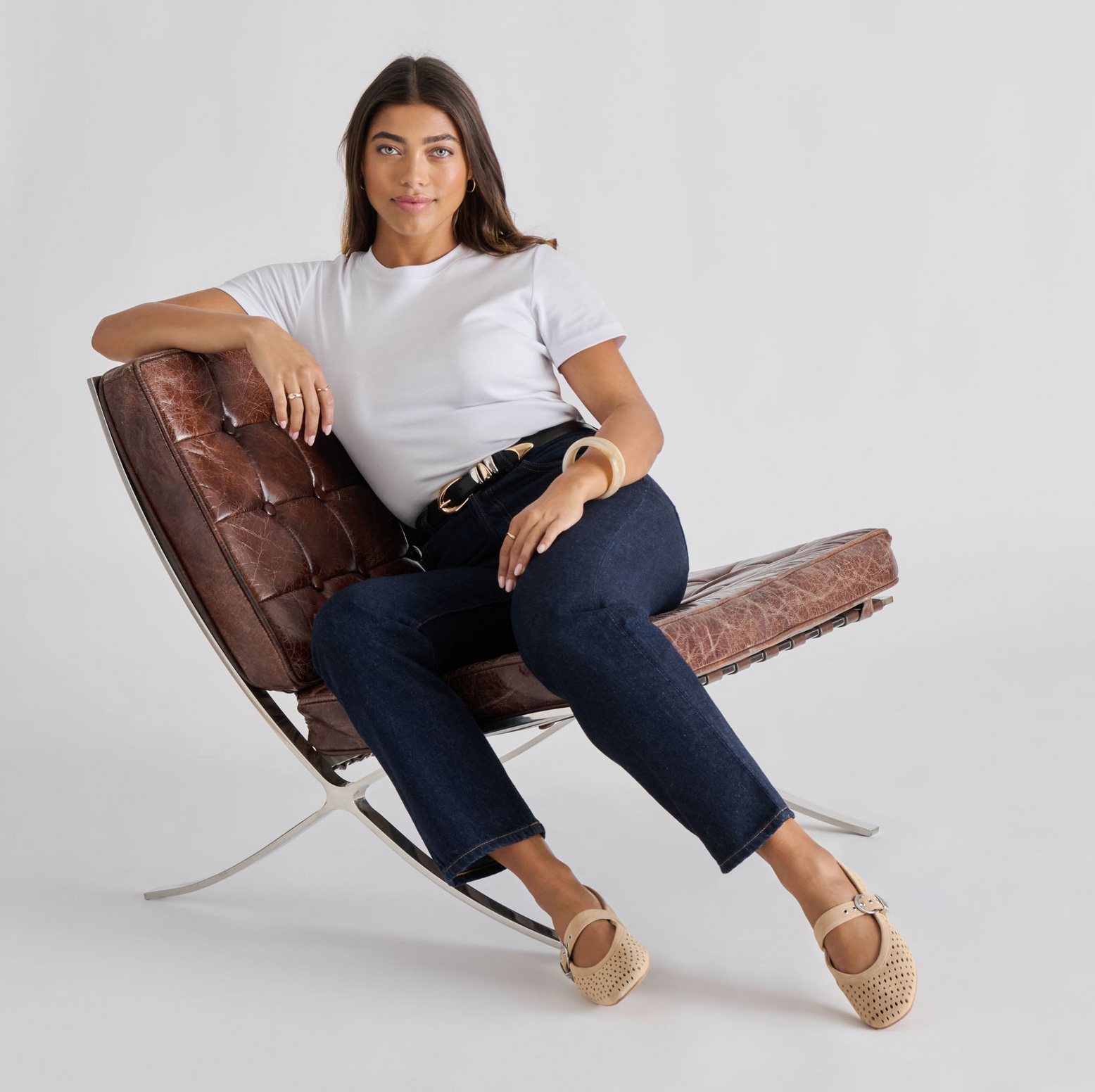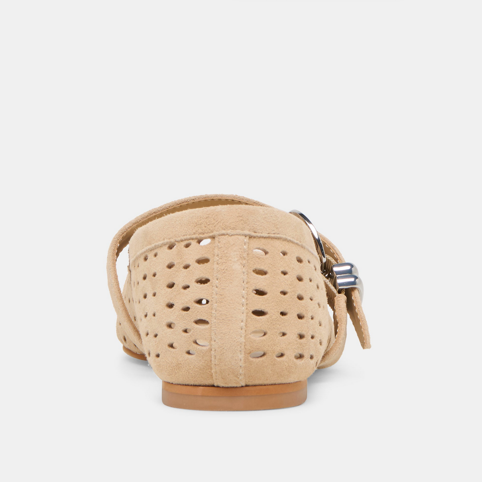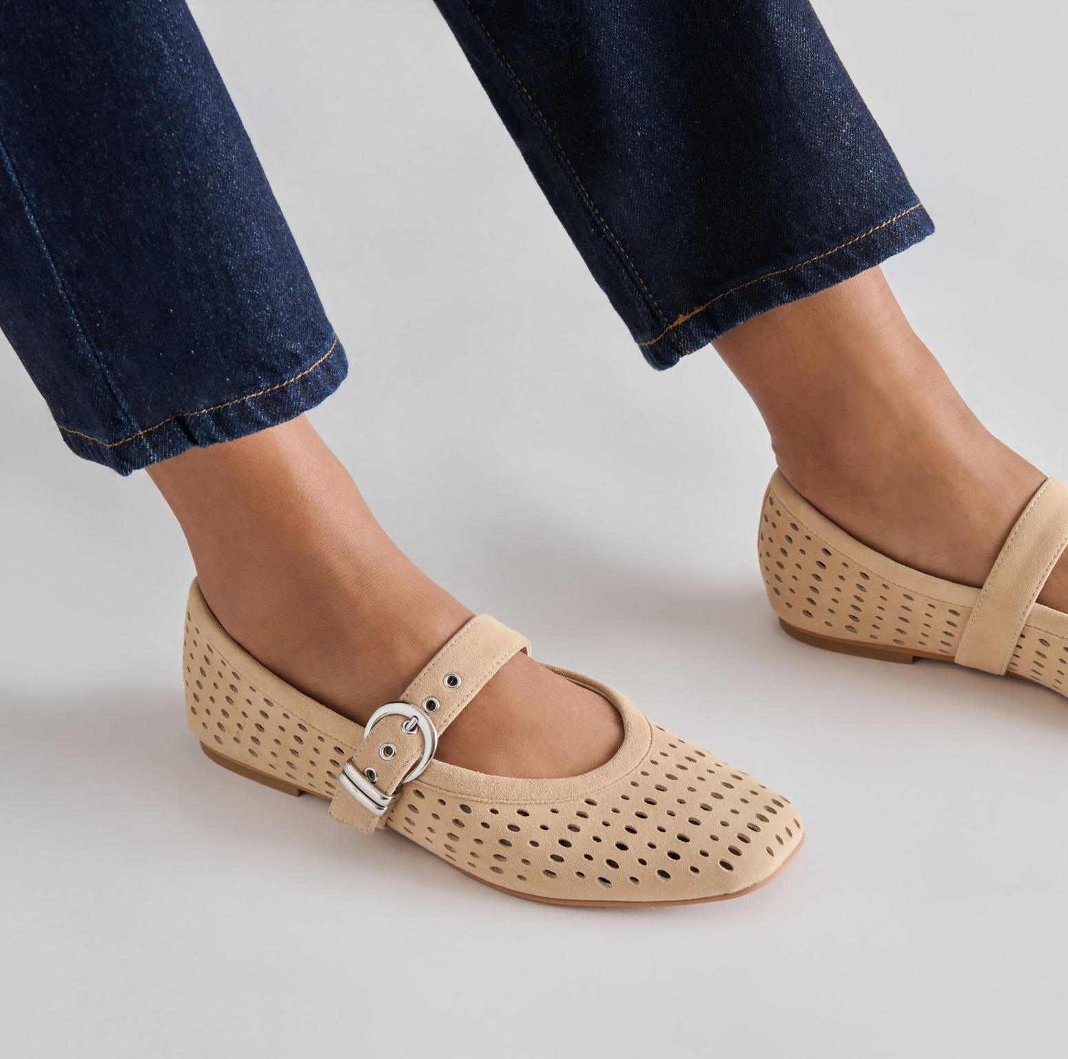 An everyday flat with bold details. MIKEL’s classic ballet flat silhouette is upgraded to statement style status with an adjustable strap, shining gold metal buckles, and attention-grabbing texture. Top-to-bottom perforated leather or velvety suede give this versatile essential fashion-forward dimension. Choose from an array of neutral and classic colorways like camel, off white, or light brown and pair her with everything from midi dresses to white linen pants. Sustainably-crafted with recycled and waterbased materials, this style fits into every part of your week.