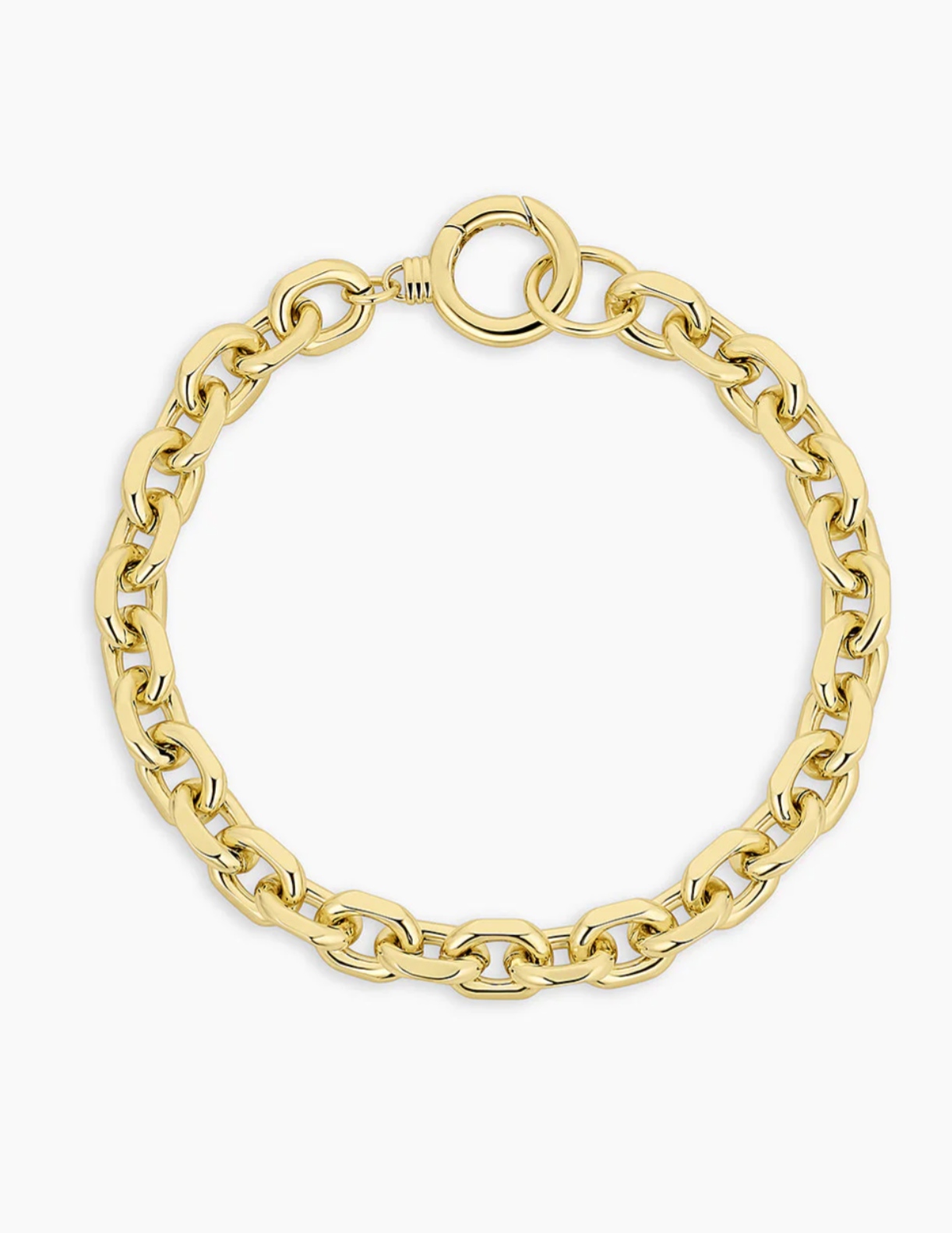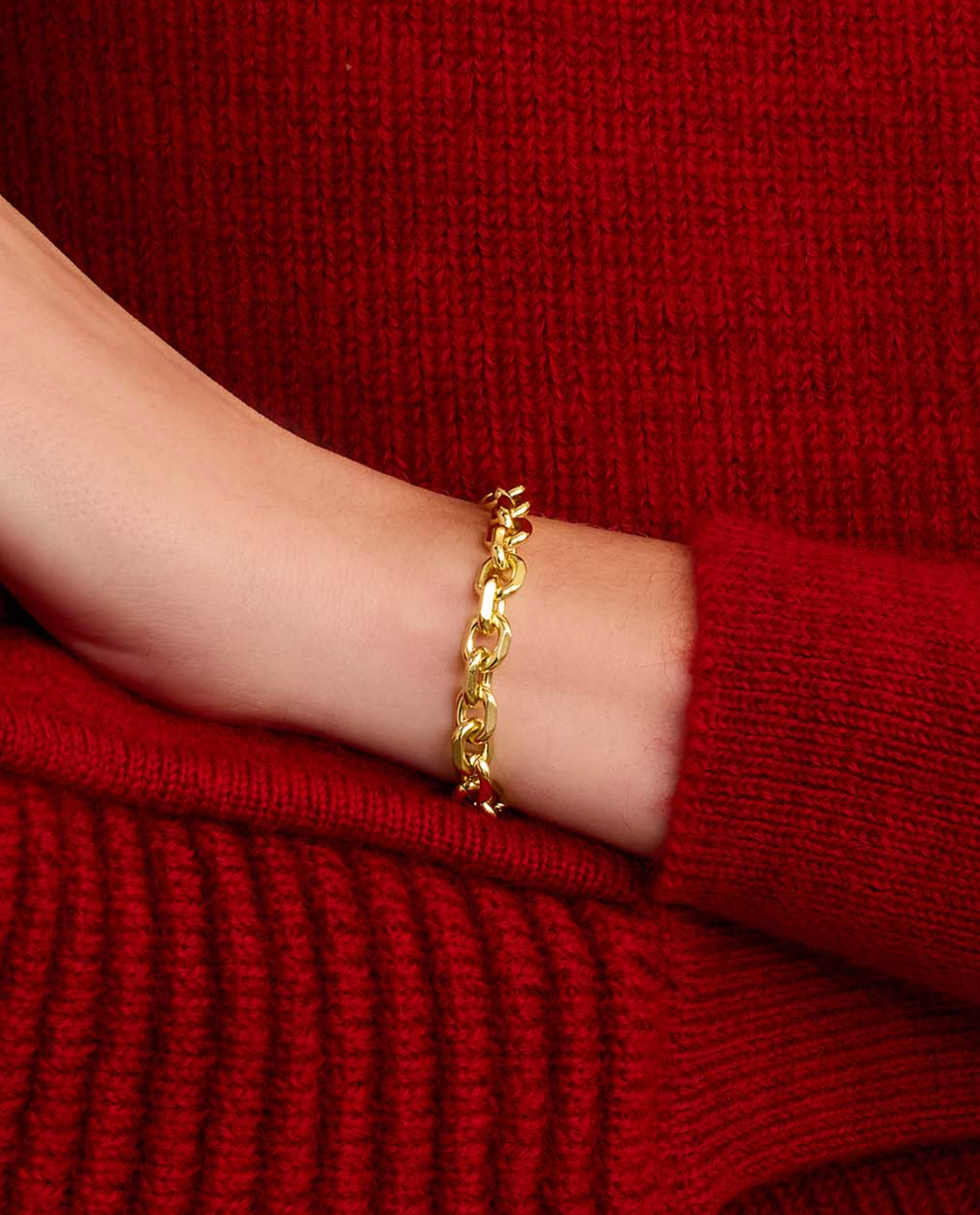 With its bold, oversized links, this 18k gold plated statement chain bracelet is a must-have. Whether worn with a soft sweater or paired with a chic evening dress, it adds a touch of cool sophistication to any look.