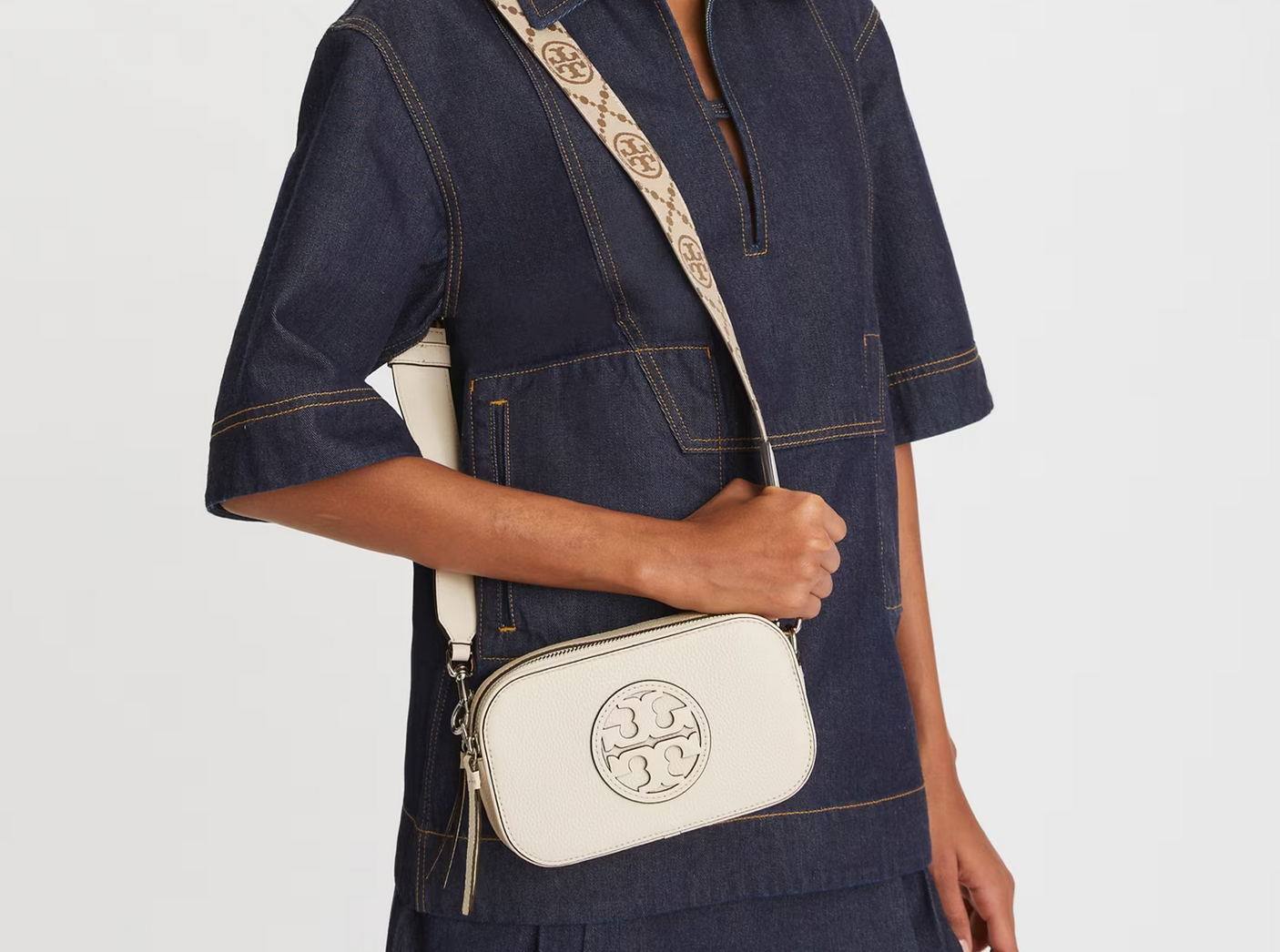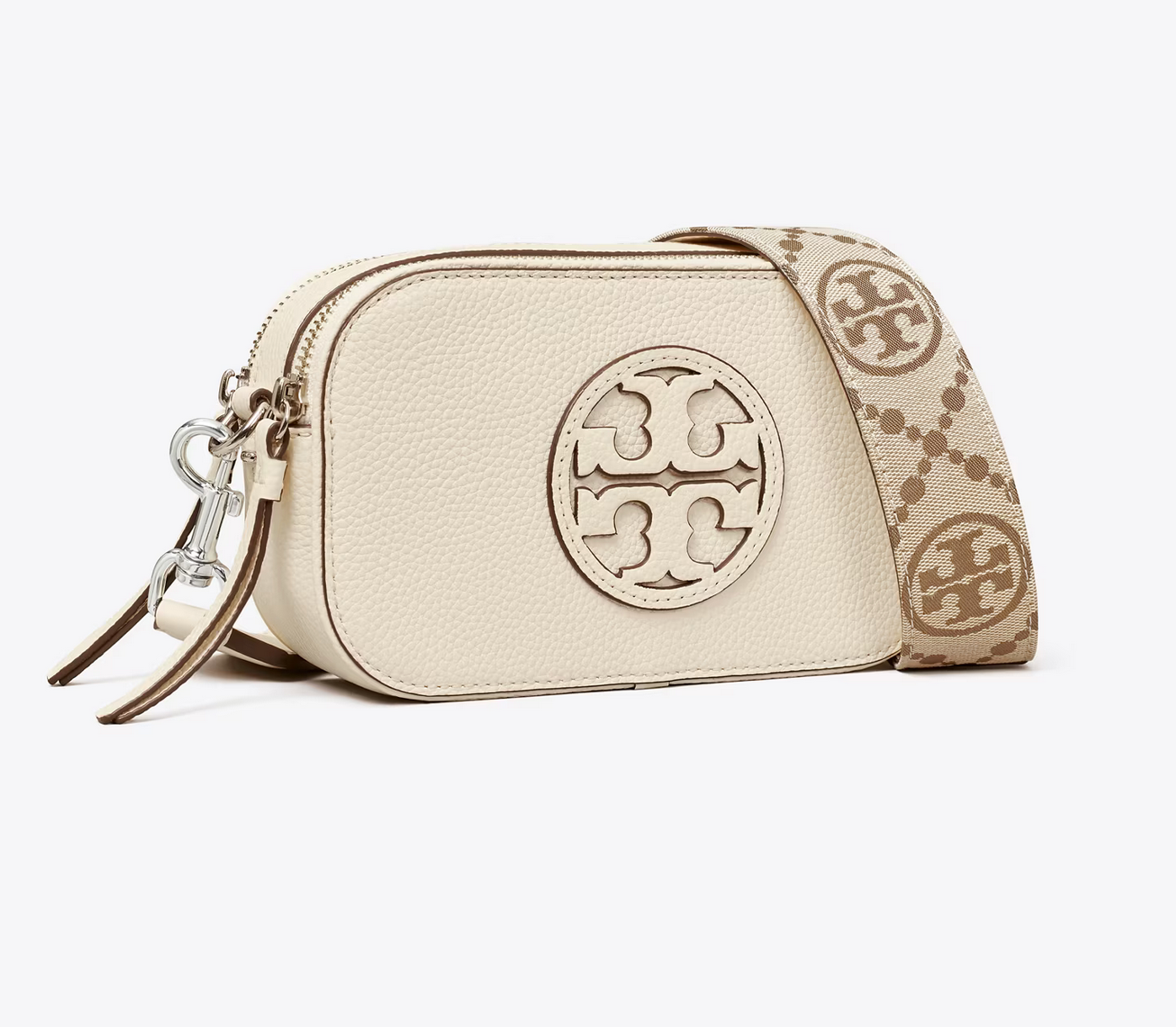 A new shape from our signature collection. The Mini Miller Crossbody Bag is crafted in soft pebbled leather with two zippered compartments and a laser-cut Double T. Wear it with or without the removable jacquard strap.