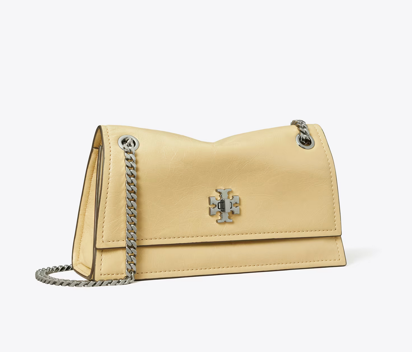 The Mini Kira Turnlock Shoulder Bag is designed with sharp angles and graphic hardware: a chunky curb chain strap and a turnlock closure. The classic flap silhouette is crafted in subtly textured leather with an interior pocket for organization.