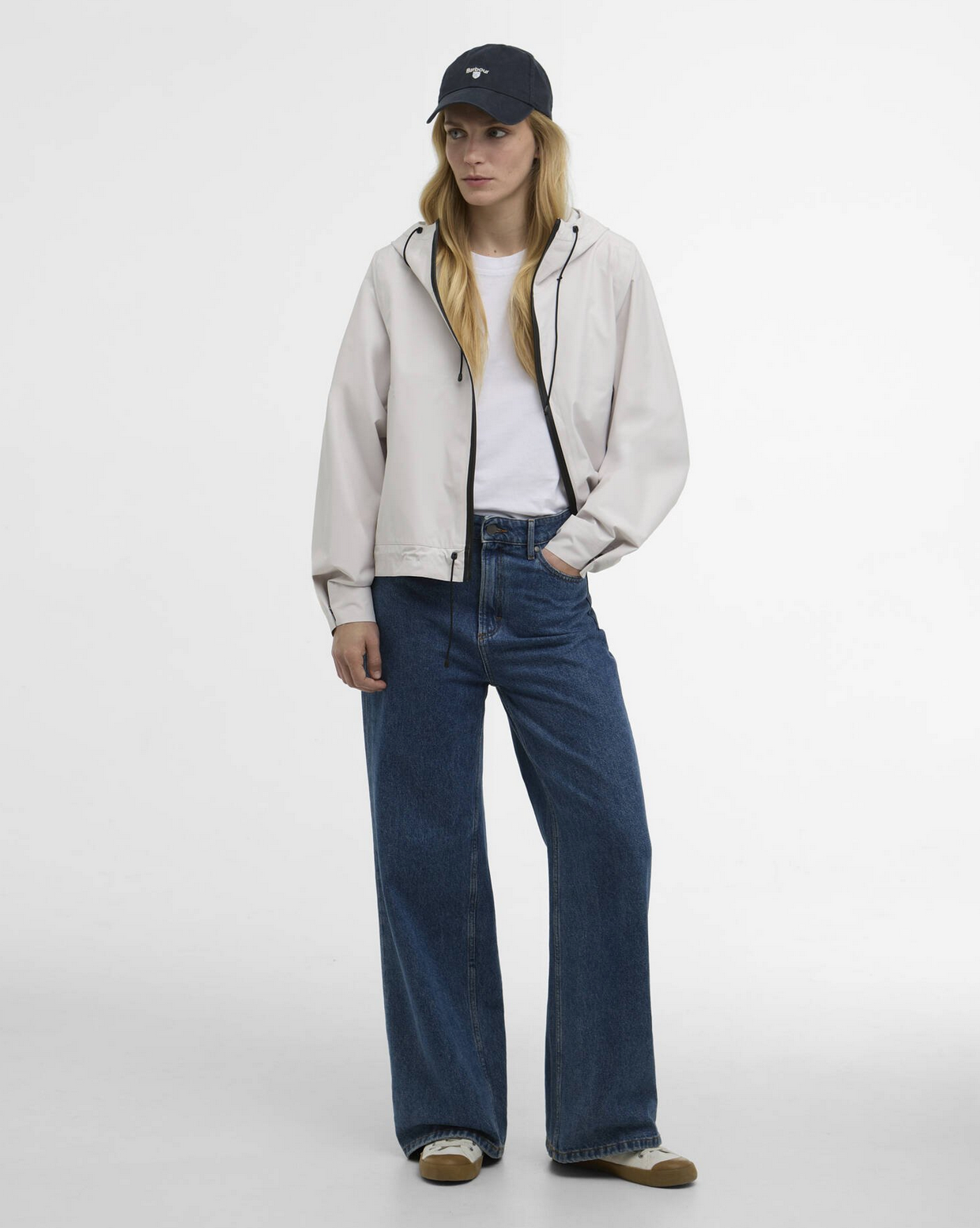 The Barbour Thorpe Waterproof Jacket is a short-length, relaxed-fit  design that combines practicality and style. Featuring a  drawcord-adjustable hem for a customisable silhouette, contrast black  trims, and wide welt pockets with stud fastenings, this jacket is  perfect for staying dry and stylish in wet weather.