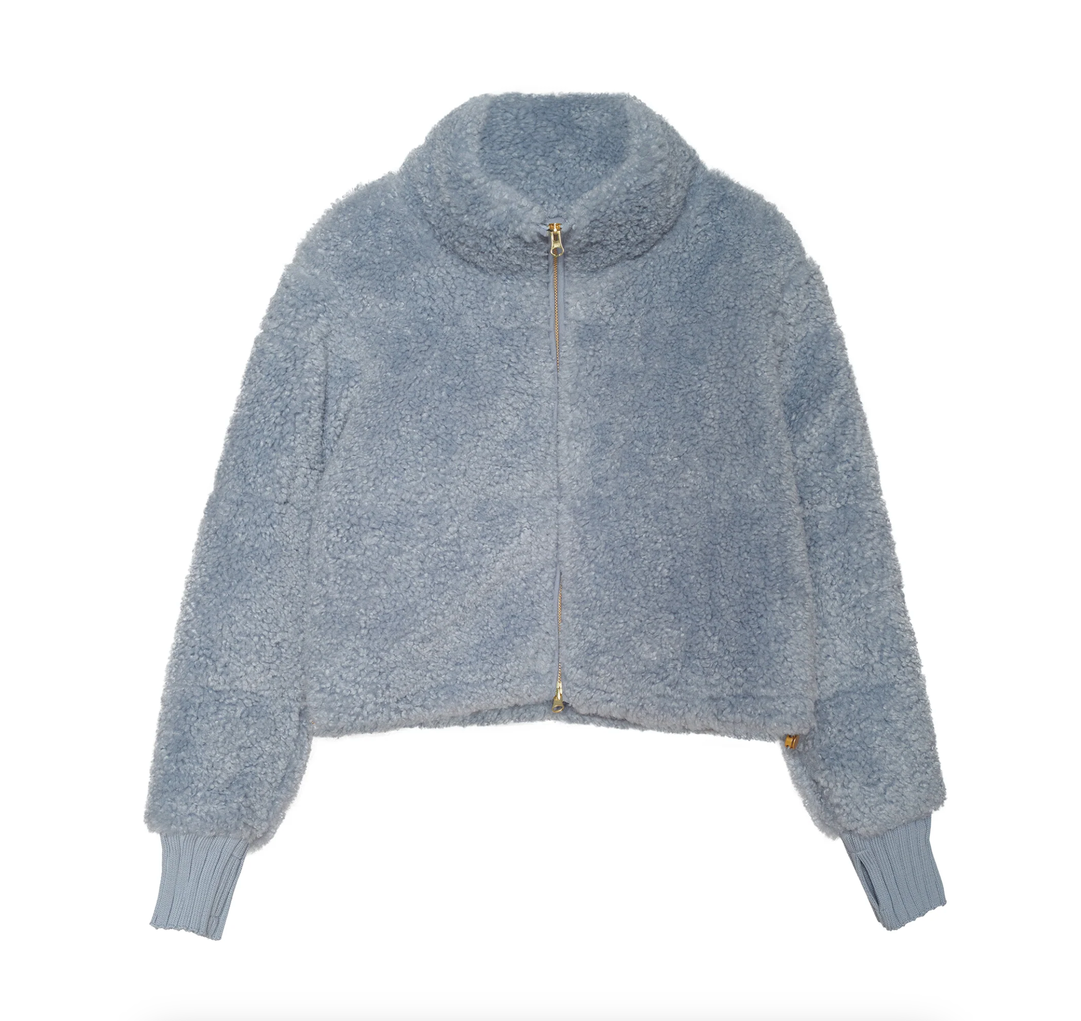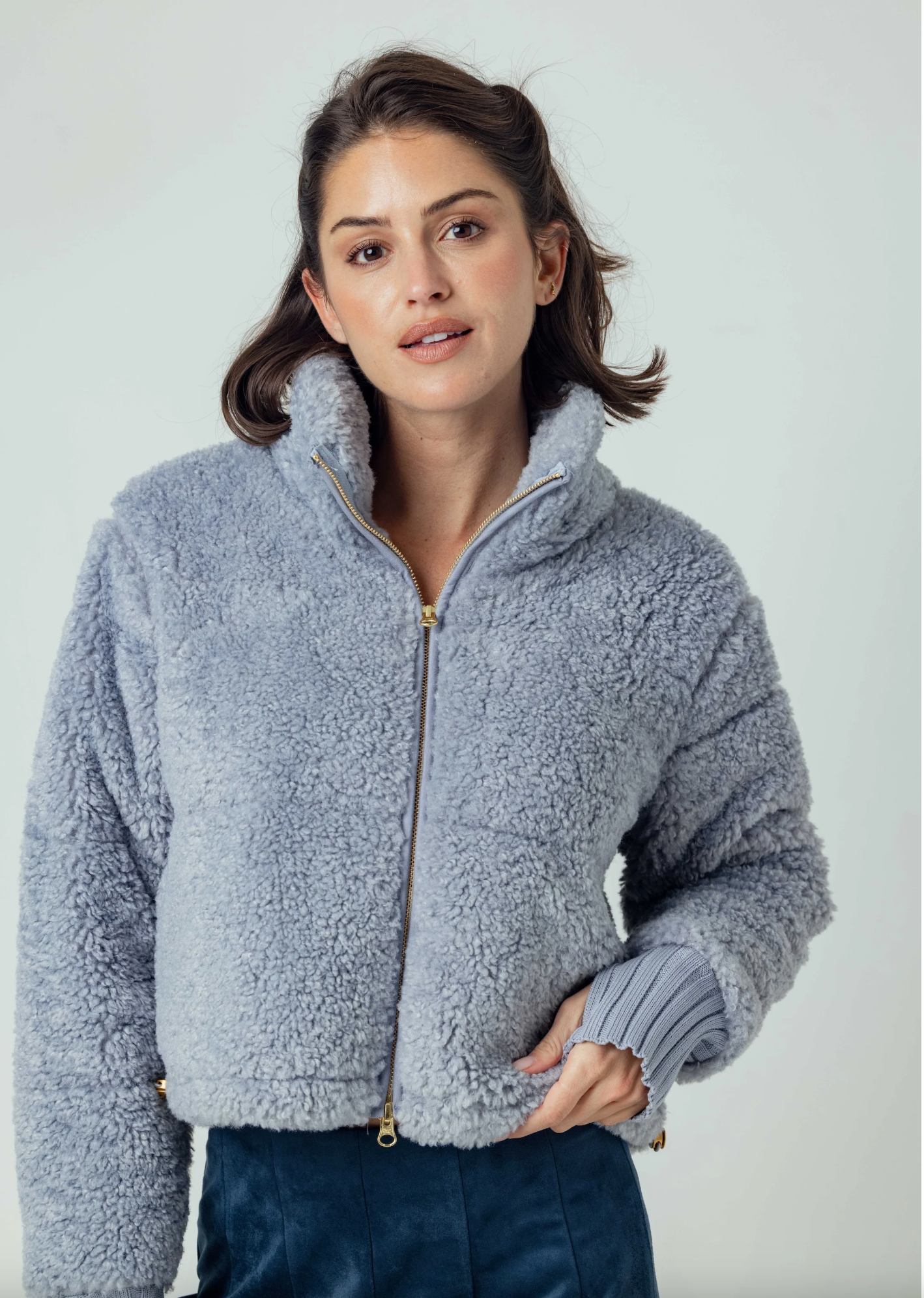 The Bobbi Jacket is a slate blue sherpa jacket designed for cozy ease. Finished with sweater rib cuffs, a zip-front closure, it features functional side-seam pockets. Slightly cropped, it falls right at the waist on most wearers. Designed with a high stand collar for added warmth, it’s finished with adjustable side drawstrings that let you cinch the waist for shape or leave relaxed for a boxier fit.