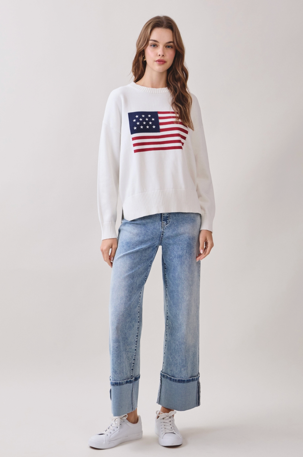 A soft knit pullover sweater featuring a classic American flag motif at the front. Designed with a relaxed silhouette, crew neckline, and long sleeves for effortless comfort. Finished with ribbed trim at the neckline, cuffs, and hem for a clean, polished look.