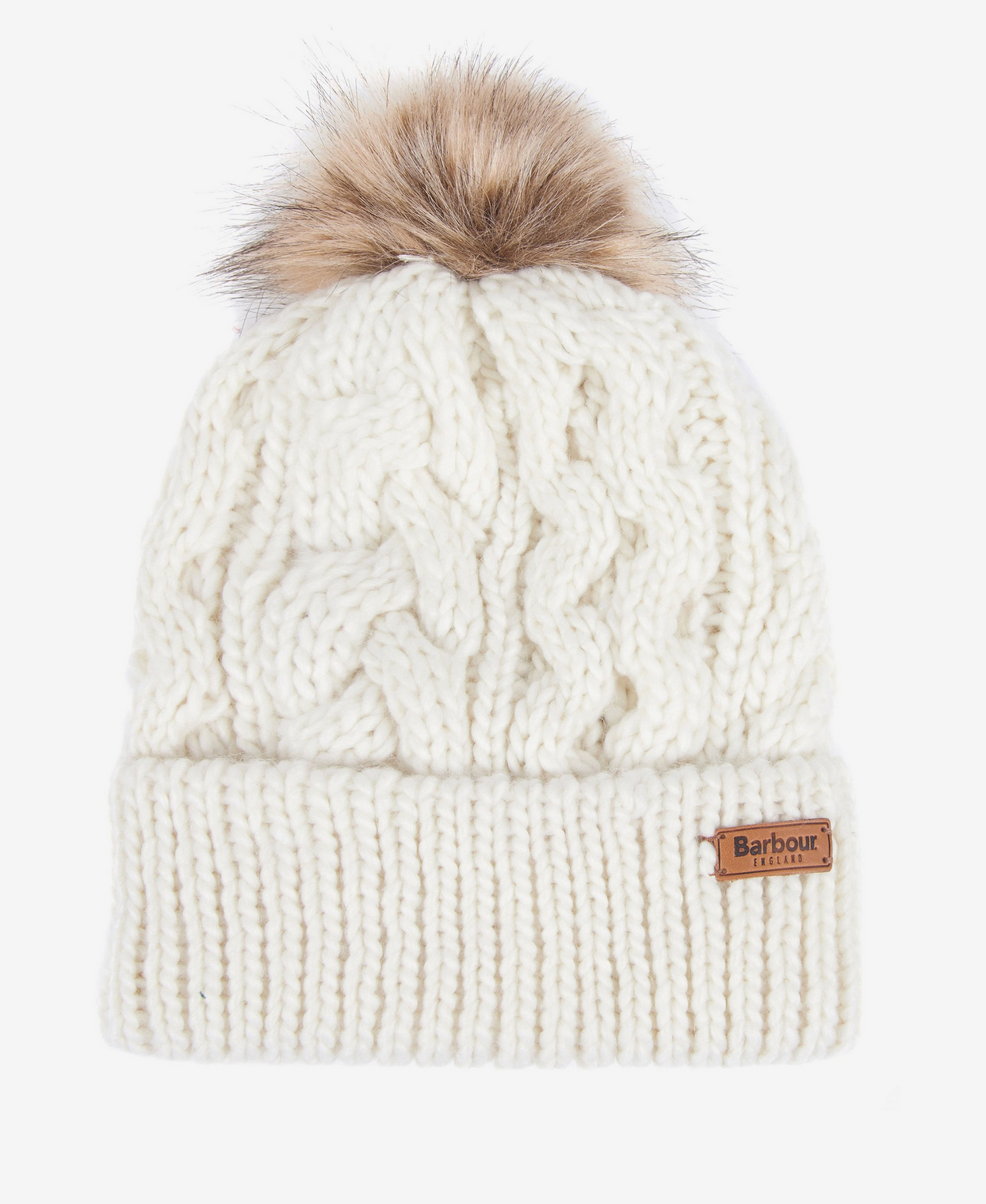 Combining a cable-knit structure with a ribbed turnback, this knitted beanie is trimmed with a faux-fur pom-pom and a logo-embossed leather badge.