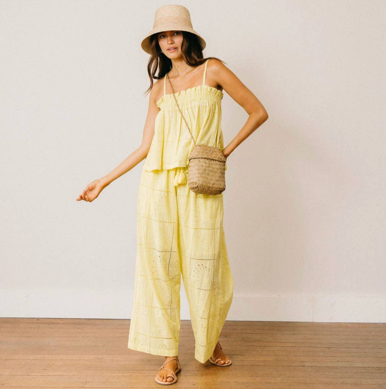 The Daphne Pant features a relaxed wide-leg silhouette with an adjustable drawstring waist and playful tassel ties. Designed with a comfortable pull-on fit and lightweight feel, these vacation-ready pants are perfect for beach cover-ups, resort lounging, or strolling seaside markets. Size and Fit: XS: 00–0 S: 2–4 M: 6–8 L: 10–14 XL: 16–18 XXL: 20-22 Details: Lined cotton eyelet Wide-leg resort pant silhouette Adjustable drawstring waist with tassel ties Care: Hand wash cold and hang dry