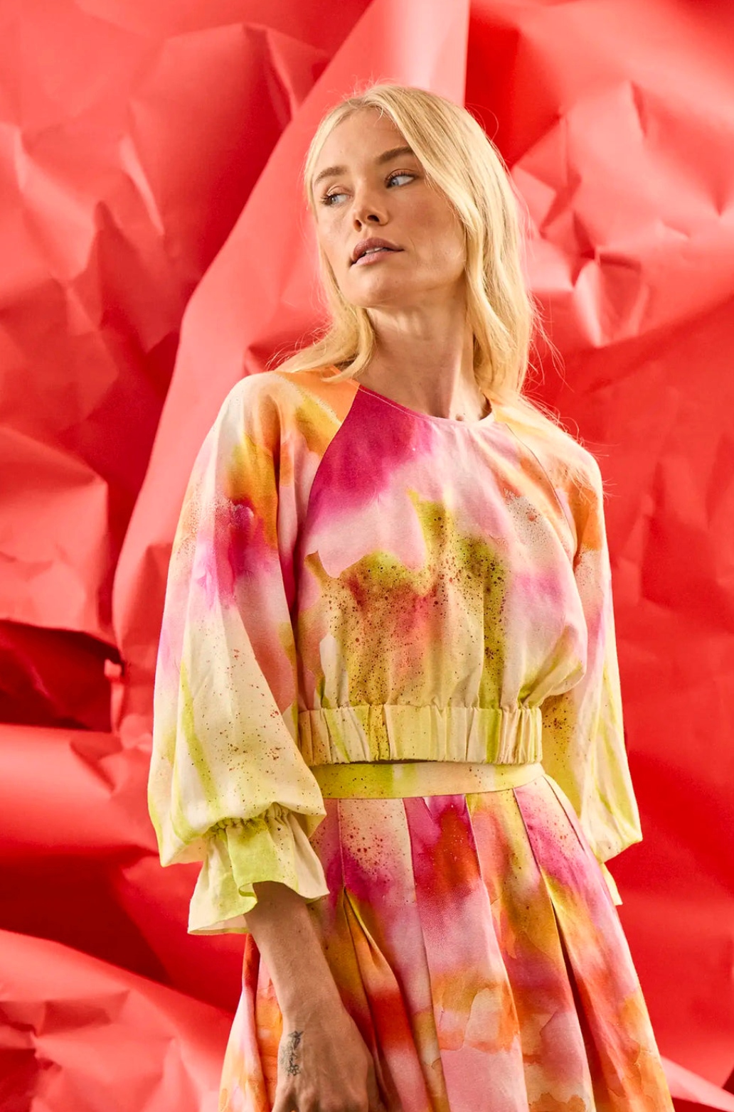 Introducing the Kirsten Top, a cropped long-sleeve silhouette in our linen-blend Electric Daydream print. Designed with a clean crew neckline and elastic at the waist and sleeves for soft structure, Kirsten brings a modern, feminine shape to the season. Pair it with the matching Alexis Skirt for a striking head-to-toe look.