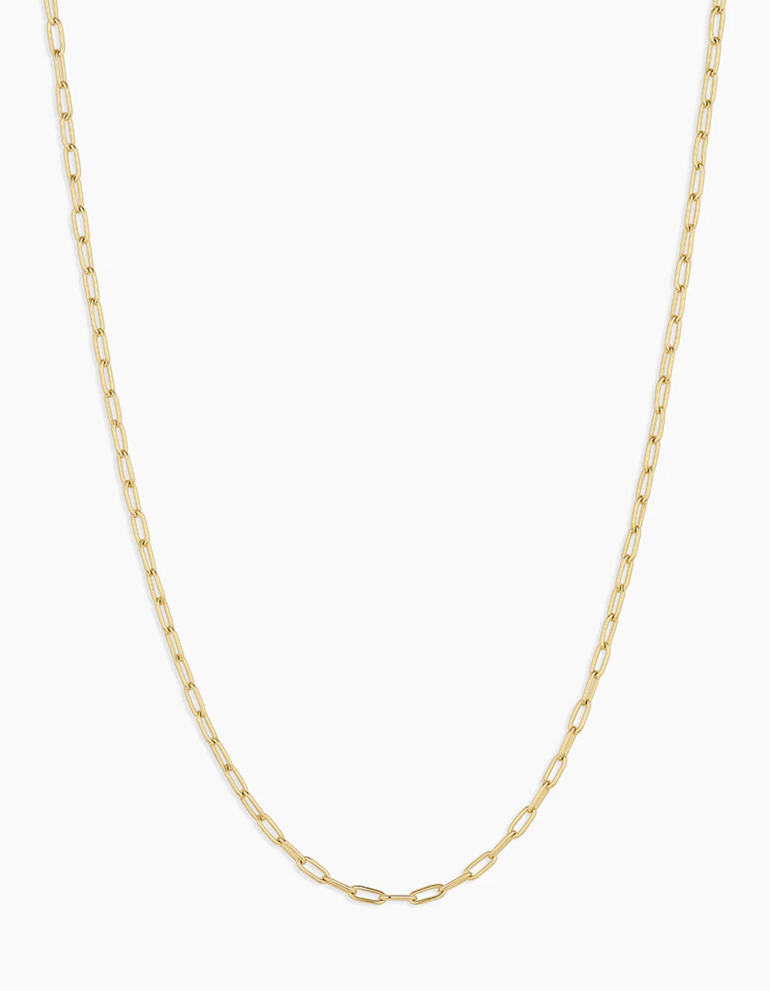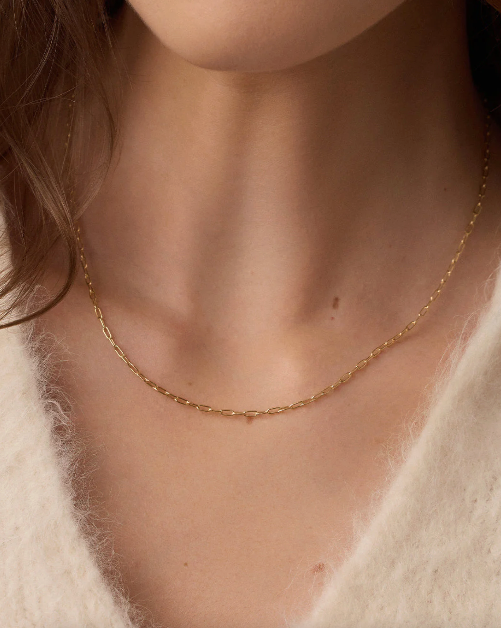 Sitting just below the collarbone, this dainty, 18k gold plated chain necklace was made to layer. Whether you choose to add charms to your chain, wear it alone, or really go for it and pair it with three or four other necklaces, this chain's lightweight feel and interesting links will make it a go-to piece in your rotation.