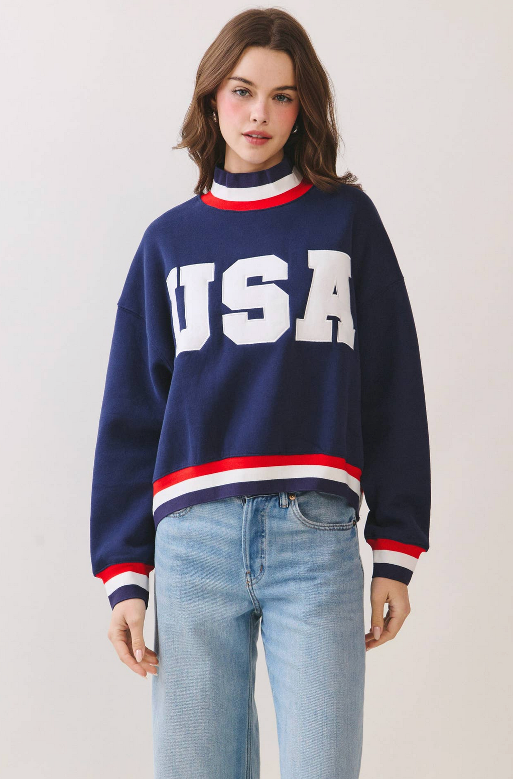 A varsity sweatshirt featuring a mock neckline and long sleeves. Designed with bold "USA" lettering at the front, finished with contrast ribbed trim at the neckline, cuffs, and hem.