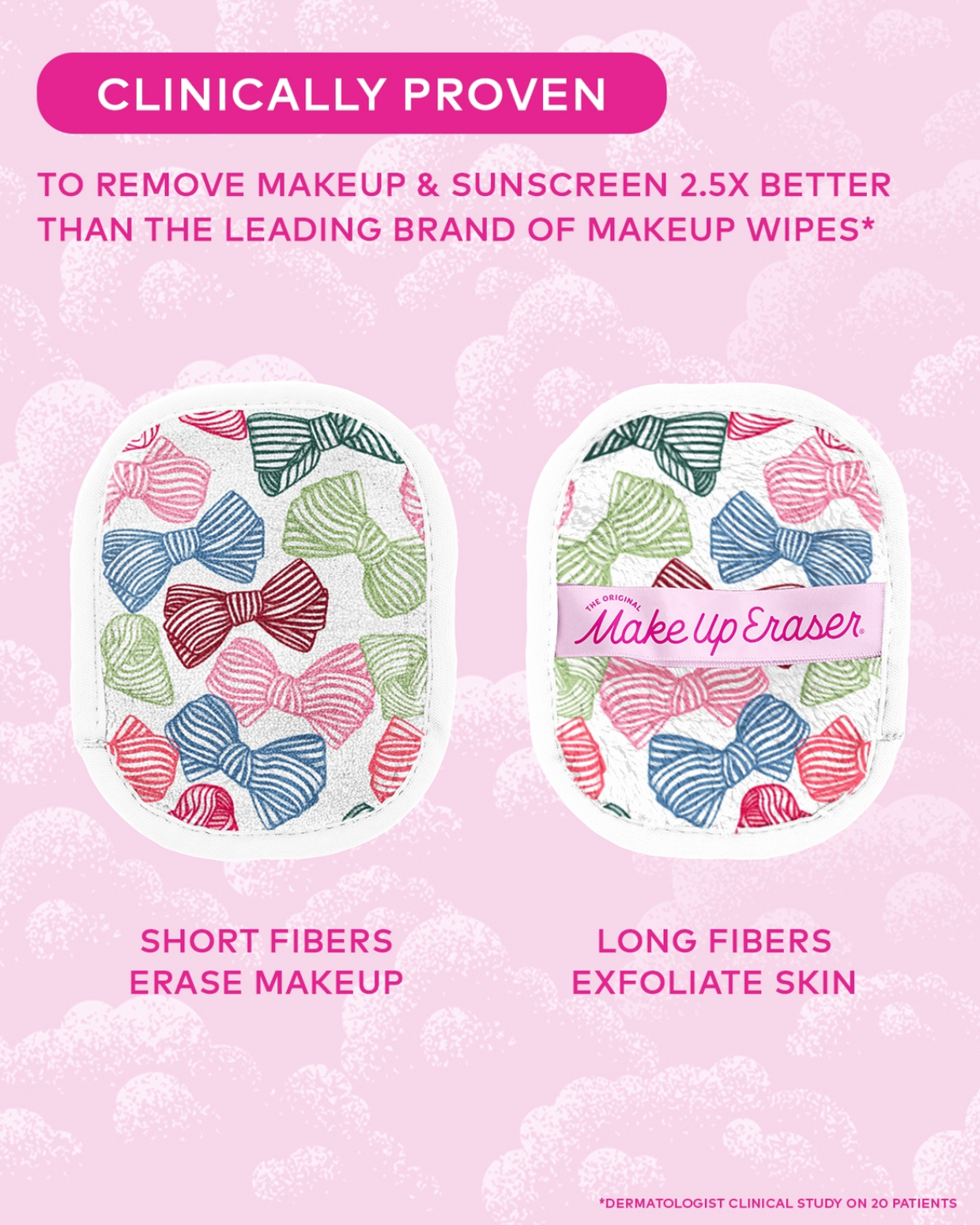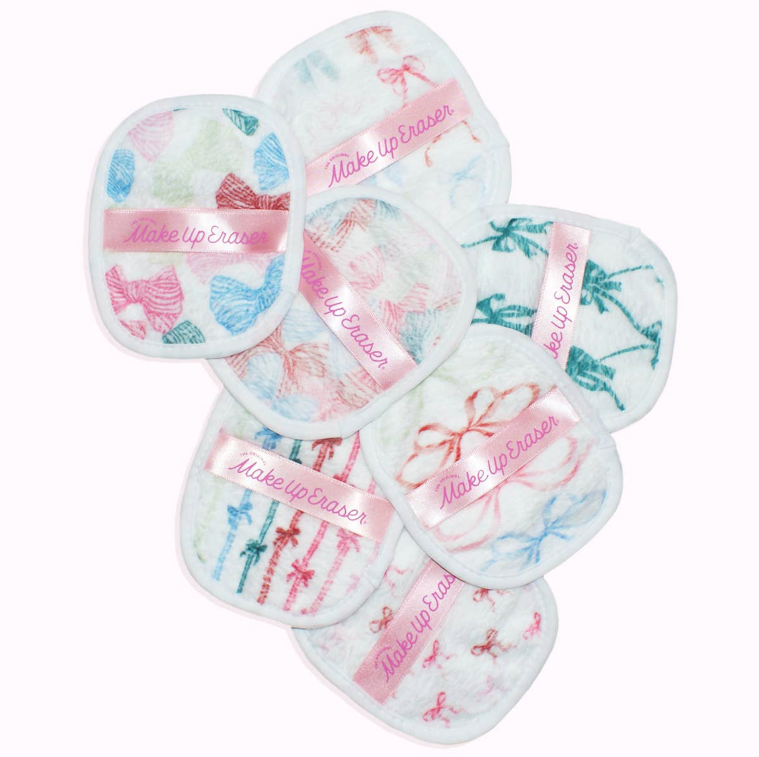 7 daily cloths, 5in x 4in. + laundry bag A whimsical & sustainable way to remove makeup. Remove all makeup with JUST WATER™ including waterproof. Our patented, water-activated makeup remover uses cloud-soft fibers to gently & easily remove all cosmetics & sunscreen/SPF from pores. 2 in 1 benefit: Makeup Remover & Exfoliator ✓ Dermatologist Recommended ✓ SmartErase™ Technology ✓ Reusable (300X) ✓ Great for everyday & professional makeup removal ✓ Eco-friendly & simplified skincare ✓ TSA The Original MakeUp Eraser® removes makeup 2.5X better than the leading makeup wipe is non-irritating & non-drying, making it perfect for sensitive skin. It's safe for eyelash extensions & oil-free, perfecting your sustainable beauty routine. Wet cloth with warm water. Use gentle circular motions to remove makeup & flip to the other side to exfoliate. Machine wash & dry. Dryer sheet & fabric softener safe.