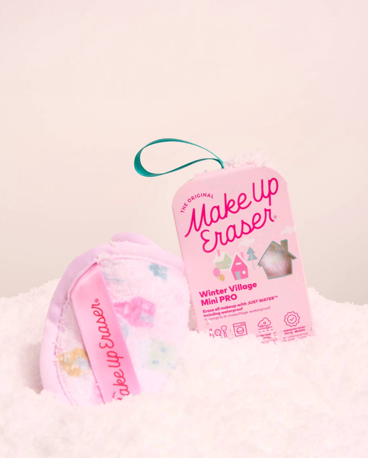 1 Mini PRO cloth 8in x 4in. A sustainable gift with vintage Christmas nostalgia. It evokes memories of collecting classic & whimsical snow villages decorated with holiday scenes. Remove all makeup with JUST WATER™ including waterproof. Our patented, water-activated, cloud-soft fibers gently & easily remove all makeup & sunscreen from pores. 2 in 1 benefit: one side erases makeup & one side exfoliates skin. ✓ Dermatologist Recommended ✓ SmartErase™ Skin Technology ✓ Reusable (300+ Washes) ✓ 2.5X better than makeup wipes ✓ 1 cloth = 3600 makeup wipe The Original MakeUp Eraser® is non-irritating making it perfect for sensitive skin. It's non-comedogenic, safe for lash extensions, & oil-free for a clean skincare routine. Wet with warm water. Use gentle circular motions to remove makeup with one side & flip to the other side to exfoliate skin. Machine wash hot & dry. Dryer sheet & fabric softener safe.
