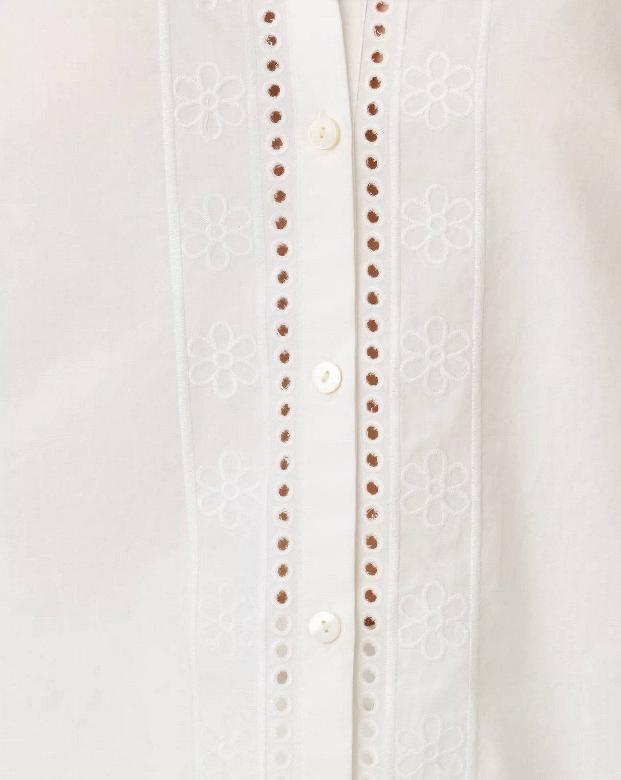 • Straight fit top with a ruffle collar, short sleeves, and a full button front closure.