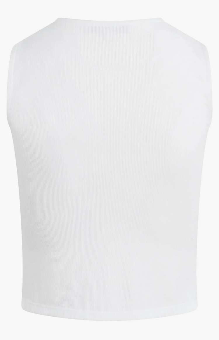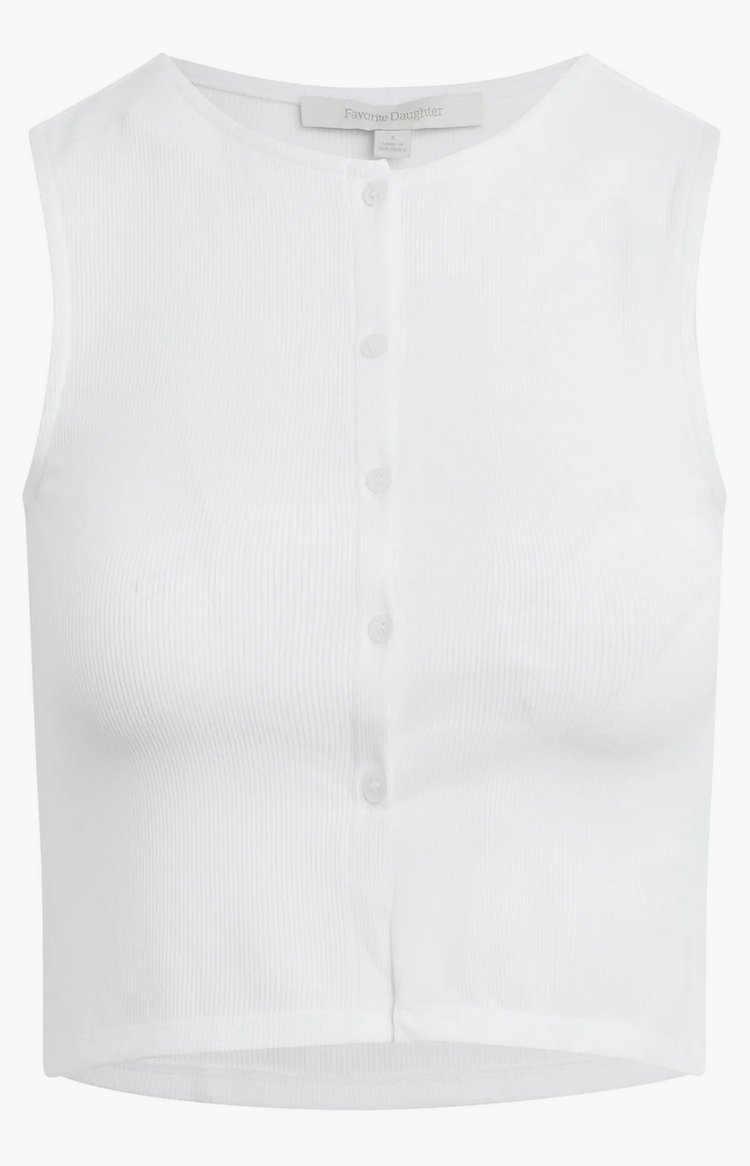 Allover ribbing lends a close fit to this cropped front-button top cut in a sleeveless silhouette.