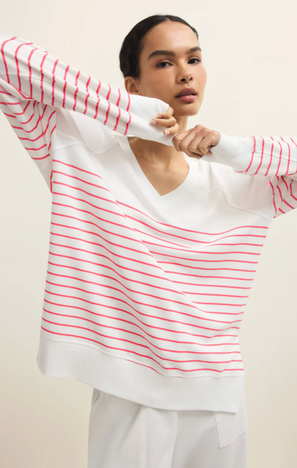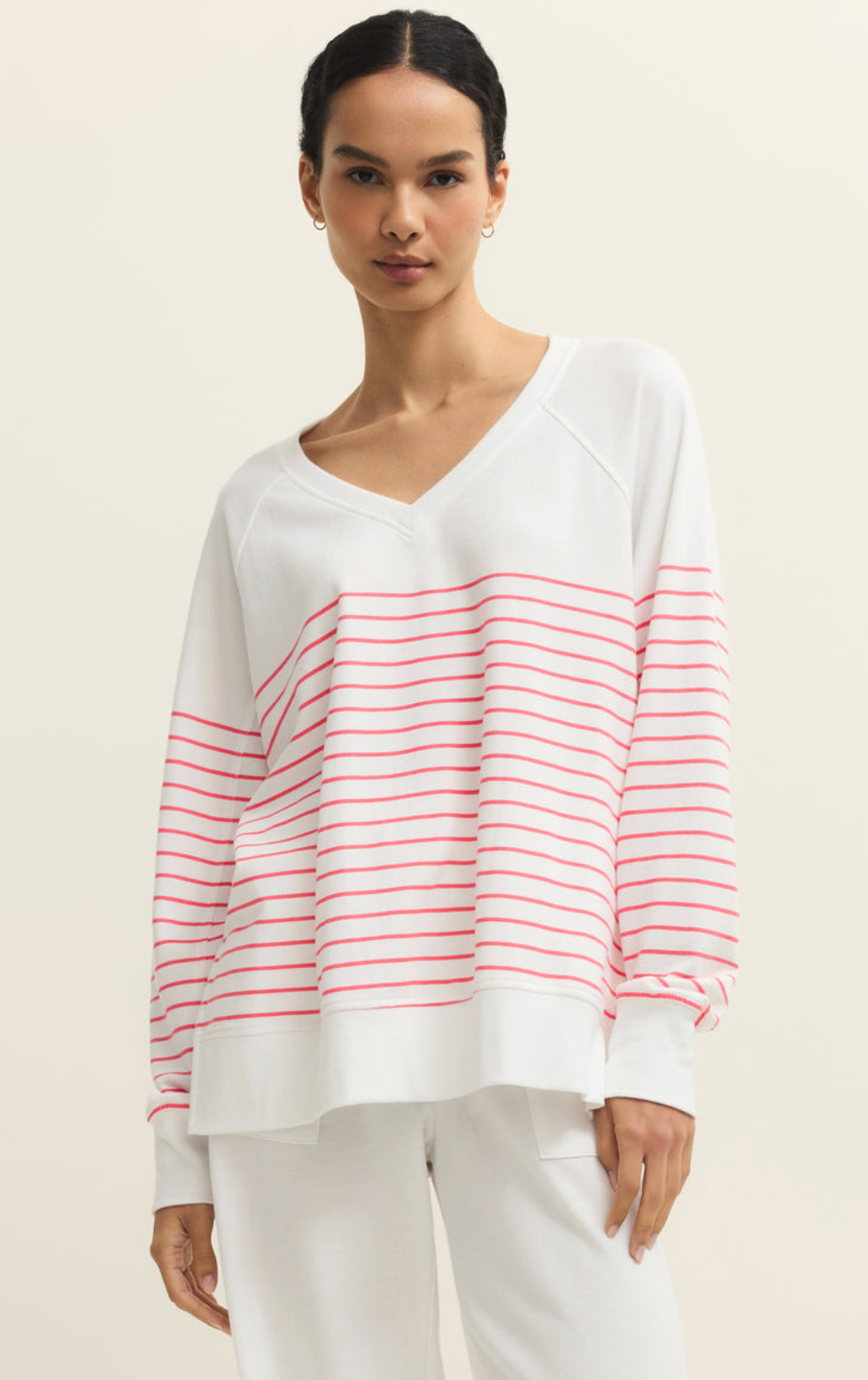Our baby french terry fabric gives this v-neck sweatshirt its soft and cozy feel. The relaxed fit makes it perfect for any activity.
