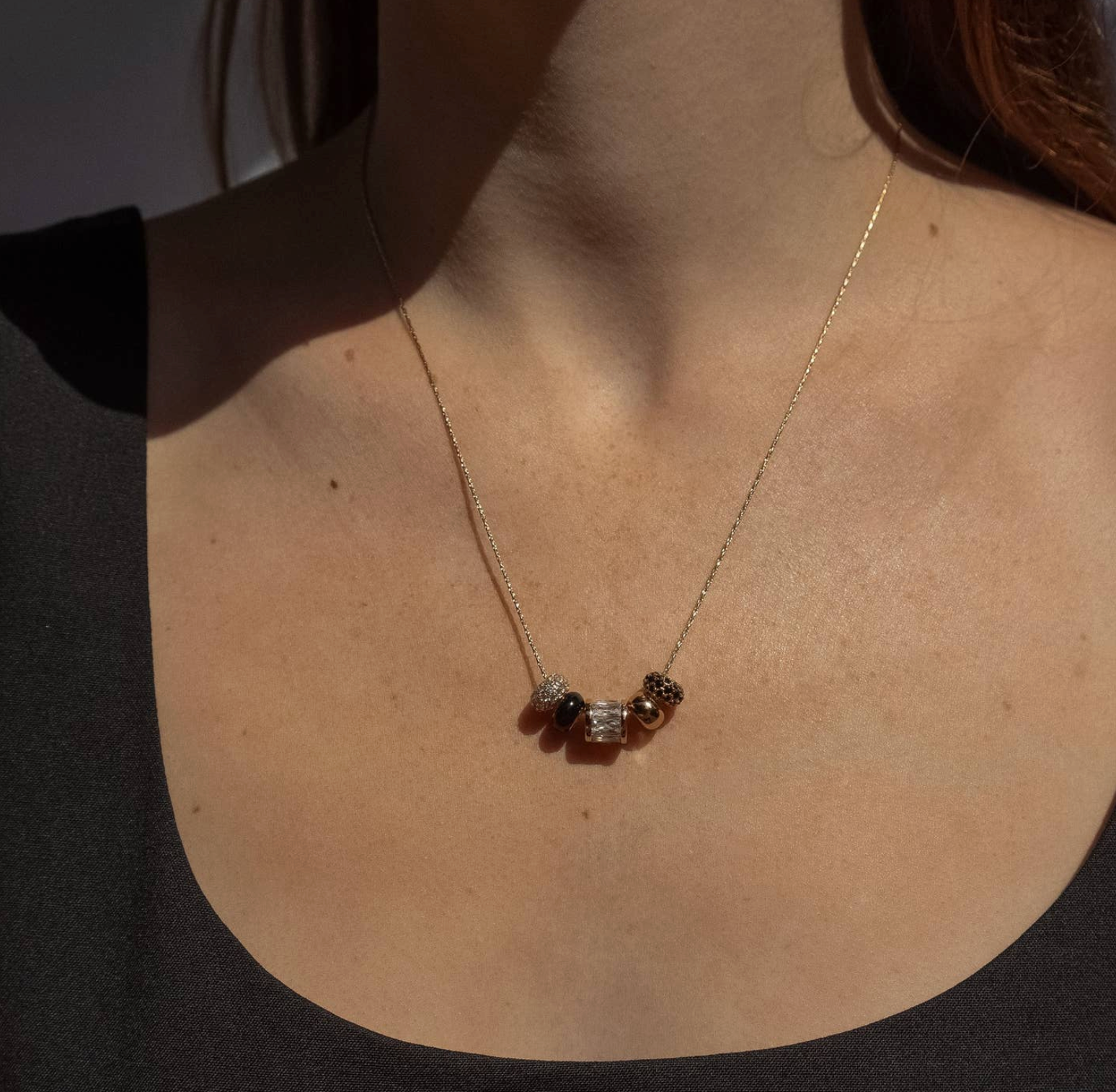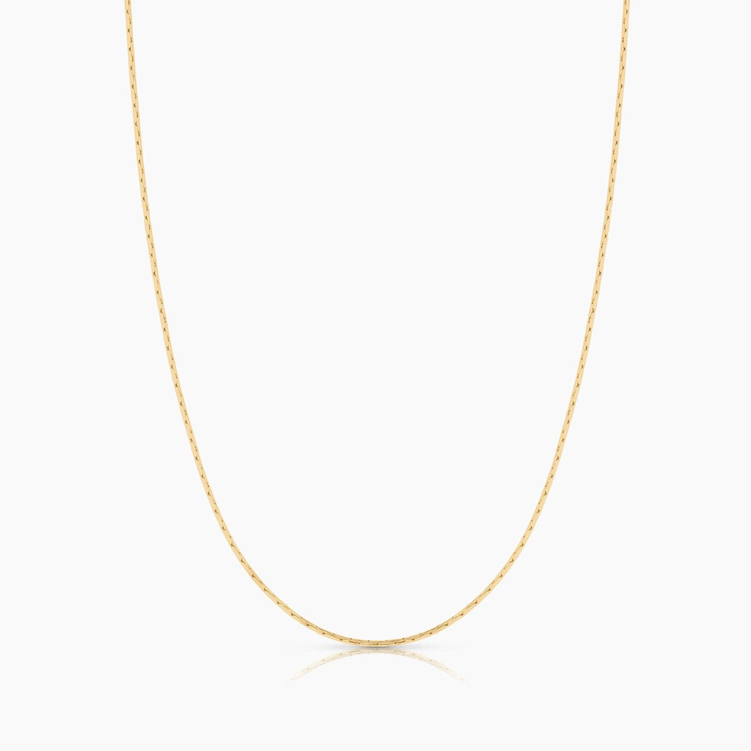 Slim and slinky—Catalina is the perfect chain for all THATCH bead charms. 14k gold plated 0.63 mm slim snake chain necklace. Adjustable between 16-18". PRODUCT NOTE: This delicate snake chain is not intended for use with our Classic, Bail, or Clip Charms.