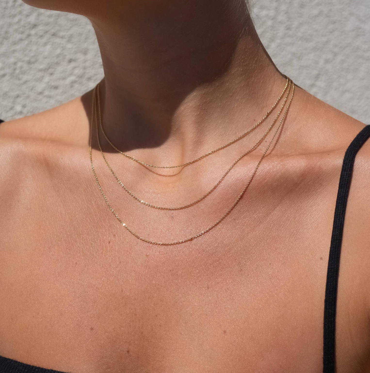 A forever brand staple—this delicate cable chain is that easy go-to for all your favorite charms and pendants. 14k gold or rhodium plated 1.2 mm cable chain.