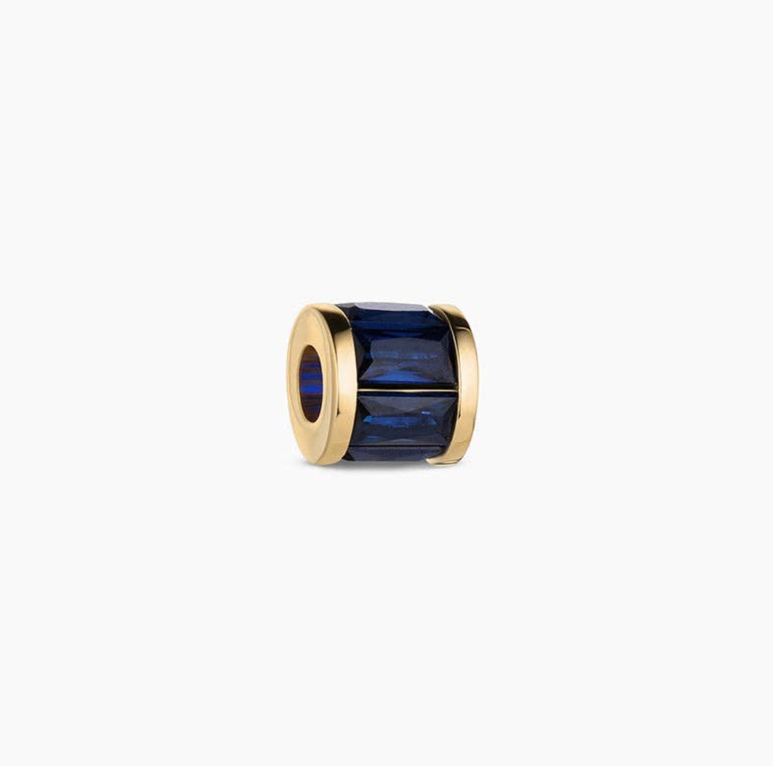 14k gold plated 8.5 mm blue cubic zirconia baguette lined bead charm. Best worn on any THATCH chain or choker measuring 4 mm thickness or less. Recommended on the Monet Choker Necklace, Rae, Finn, or Mini Drew chain necklaces, depending on your preference.
