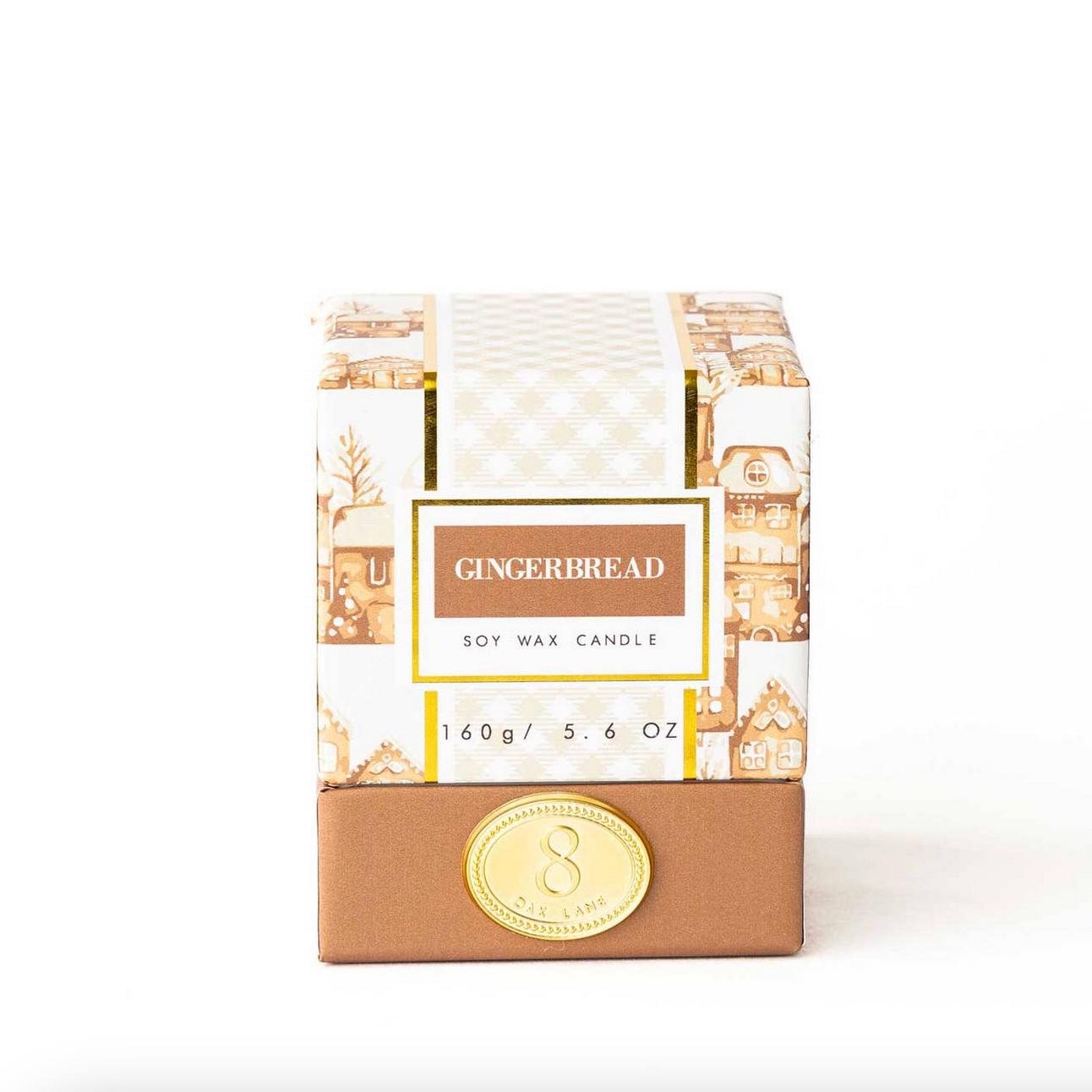 5.6oz Soy Wax Candle – Giftable & Scented!  Experience the perfect balance of fragrance and ambiance with our 5.6oz  soy wax candle. Made from clean-burning soy wax, this candle delivers a  steady, even burn that fills your space with a captivating scent from  the first light to the last. Each candle is carefully packaged in a  giftable box featuring unique printed designs that reflect the  personality of its scent, making it a beautiful addition to your home or  a thoughtful gift for someone special. Compact yet impactful, this  candle brings warmth, charm, and a delightful aroma to any room, turning  everyday moments into memorable experiences.  Capture the sweet spirit of the holidays with our Gingerbread  collection, featuring a whimsical print of pink and brown gingerbread  houses that evokes cozy, festive charm. The accompanying fragrance  blends warm and comforting notes of ginger, cinnamon, clove, nutmeg,  brown sugar, and vanilla, filling your home with the nostalgic aromas of  holiday baking. Perfect for gifting or adding a cheerful, seasonal  touch to your décor, this collection brings warmth, sweetness, and  holiday magic to every space.  Celebrate the season with our holiday fragrances, a charming and  thoughtful gift for friends and family. Perfect for gifting, our  holiday-scented items add a warm, festive touch to every holiday  occasion.    Soy Wax 5.6oz Candle Scent - Ginger, Cinnamon, Clove, Nutmeg, Brown Sugar & Warm Vanilla Designed in the USA; Imported